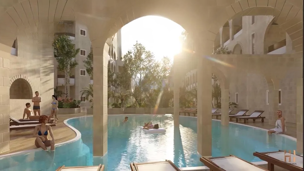 Комплекс располагает большой зоной отдыха на открытом воздухе с обилием естественного света, общим бассейном, фонтанами, организованными местами для отдыха и зелеными насаждениями.