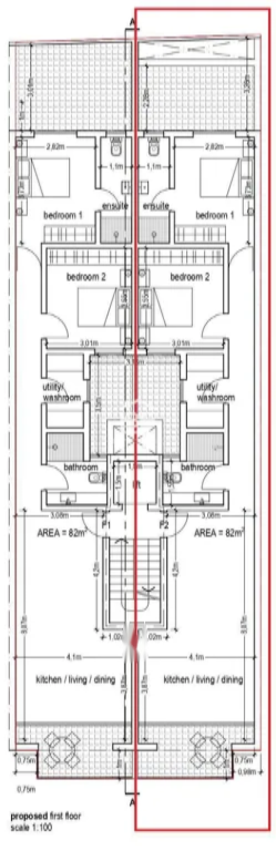 В QALA на первом этаже расположена квартира площадью 104 кв. м. Она включает кухню, совмещенную с гостиной и столовой, две спальни, ванную комнату, спальню с ванной, постирочную/кладовую, внутренний двор и террасы спереди и сзади.