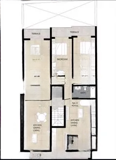 Апартамент на третьем этаже, включающий открытую кухню, гостиную и столовую зону, террасы с обеих сторон, одну спальню и главную ванную комнату.