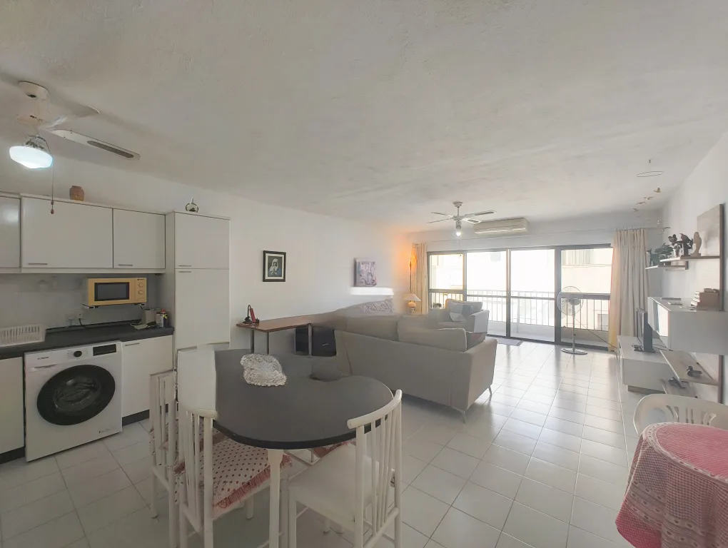 Полностью меблированная квартира является частью современного блока в тихом жилом районе. Недвижимость имеет прямоугольную планировку и включает в себя просторную открытую кухню и гостиную-столовую с выходом на фронтальную террасу, откуда открывается боковой вид на море.