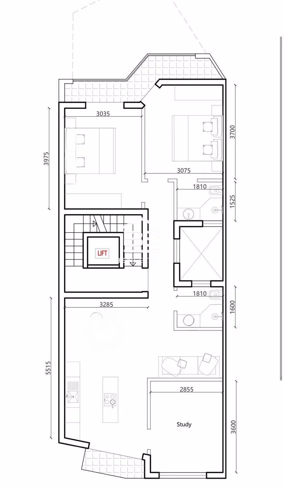 Эта квартира находится на пятом этаже в районе Гзира, рядом с набережной. Планировка включает в себя открытую кухню, гостиную и обеденную зону, которая ведет на передний балкон. В квартире также есть две спальни с двуспальными кроватями, главная из которых с собственной ванной комнатой, кабинет, главная ванная комната и балкон сзади.