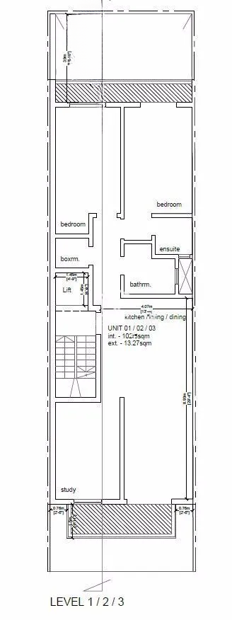 Квартира на третьем этаже, продается по плану. Включает в себя две спальни, кабинет, кладовую, две ванные комнаты, кухню/гостиную/столовую открытой планировки, а также балконы спереди и сзади.
