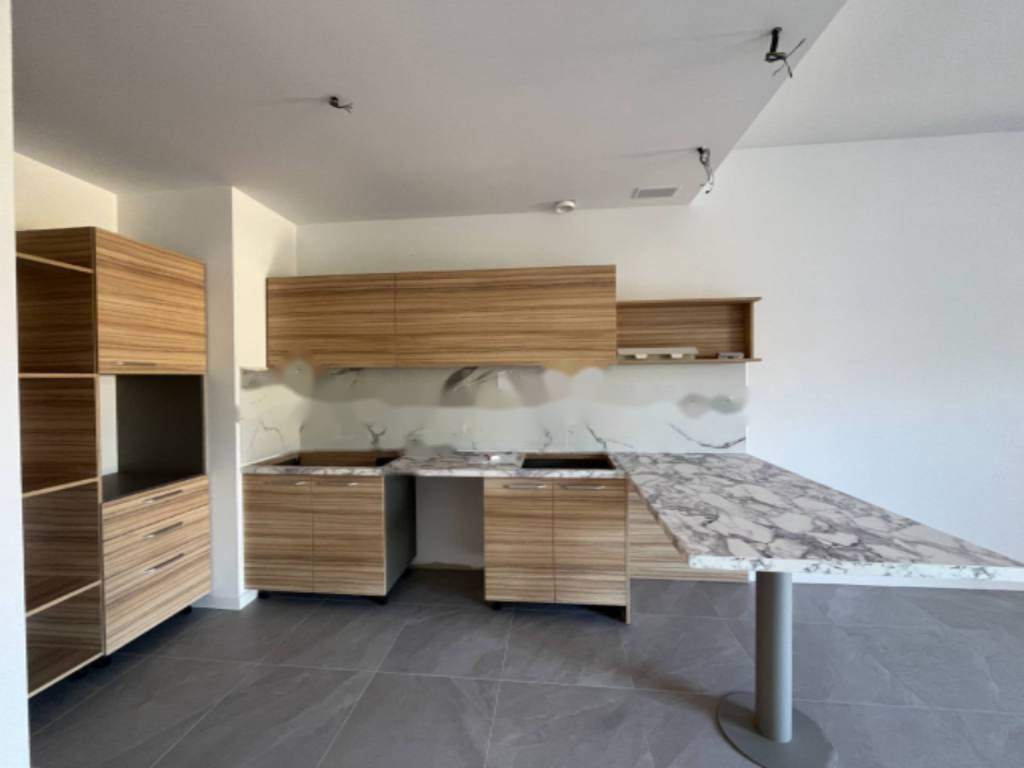 Входная зона ведет в просторную и светлую гостиную, полностью оборудованную кухней на заказ. Из гостиной через стеклянную дверь вы можете попасть на уютную обитаемую террасу, идеально подходящую для отдыха на открытом воздухе.
