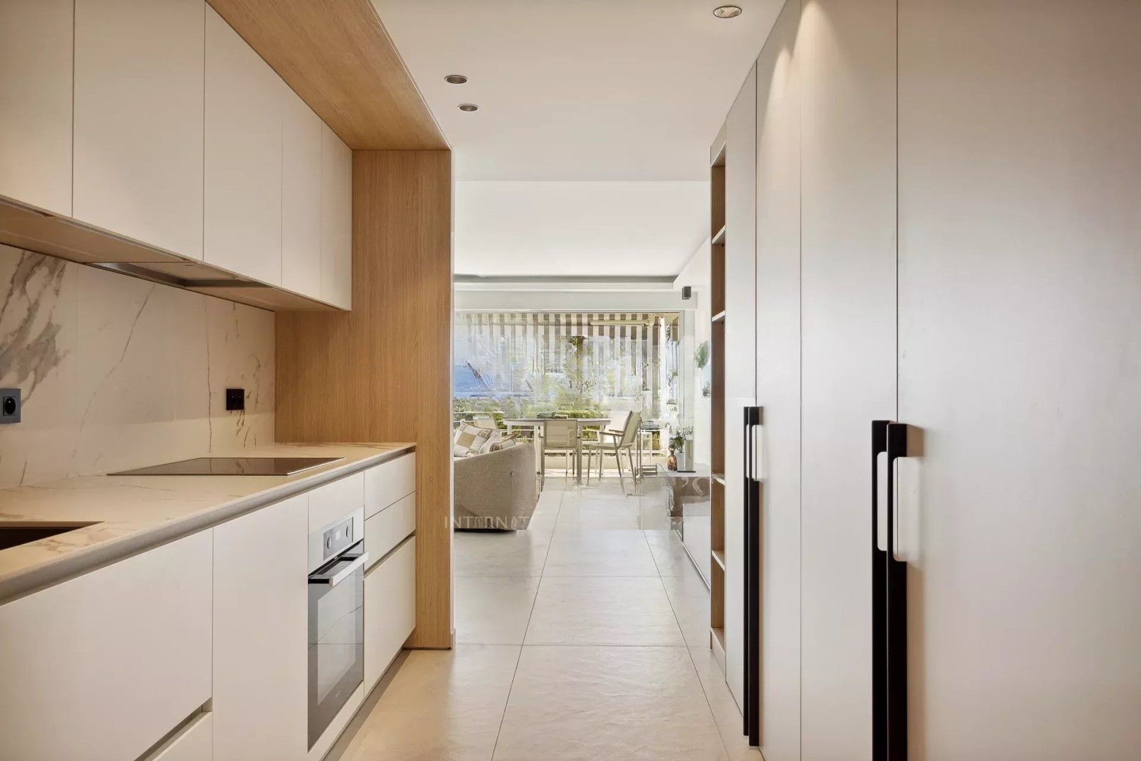 Она включает в себя прихожую, гостиную/столовую с открытой кухней, выходящей на террасу 11 м², и три спальни с ванными.