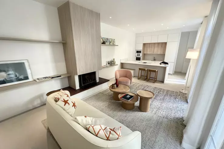 Вход с большой и светлой гостиной, действующим камином, современной кухней, прачечной.