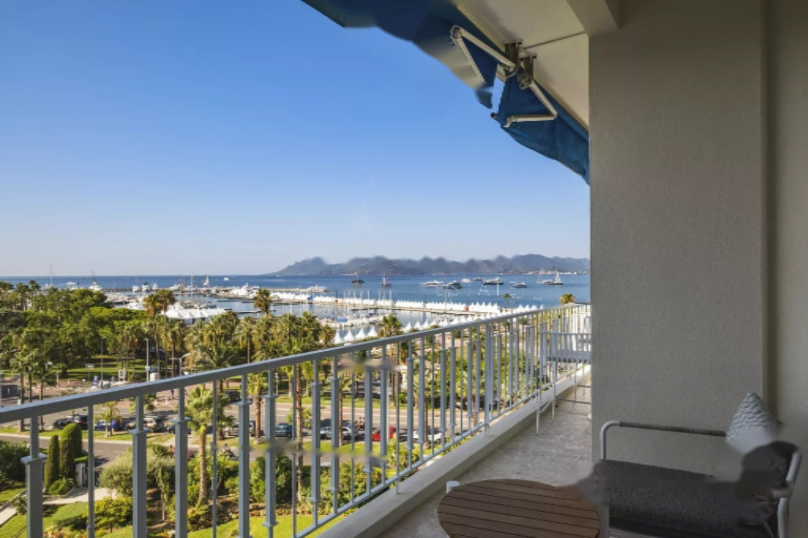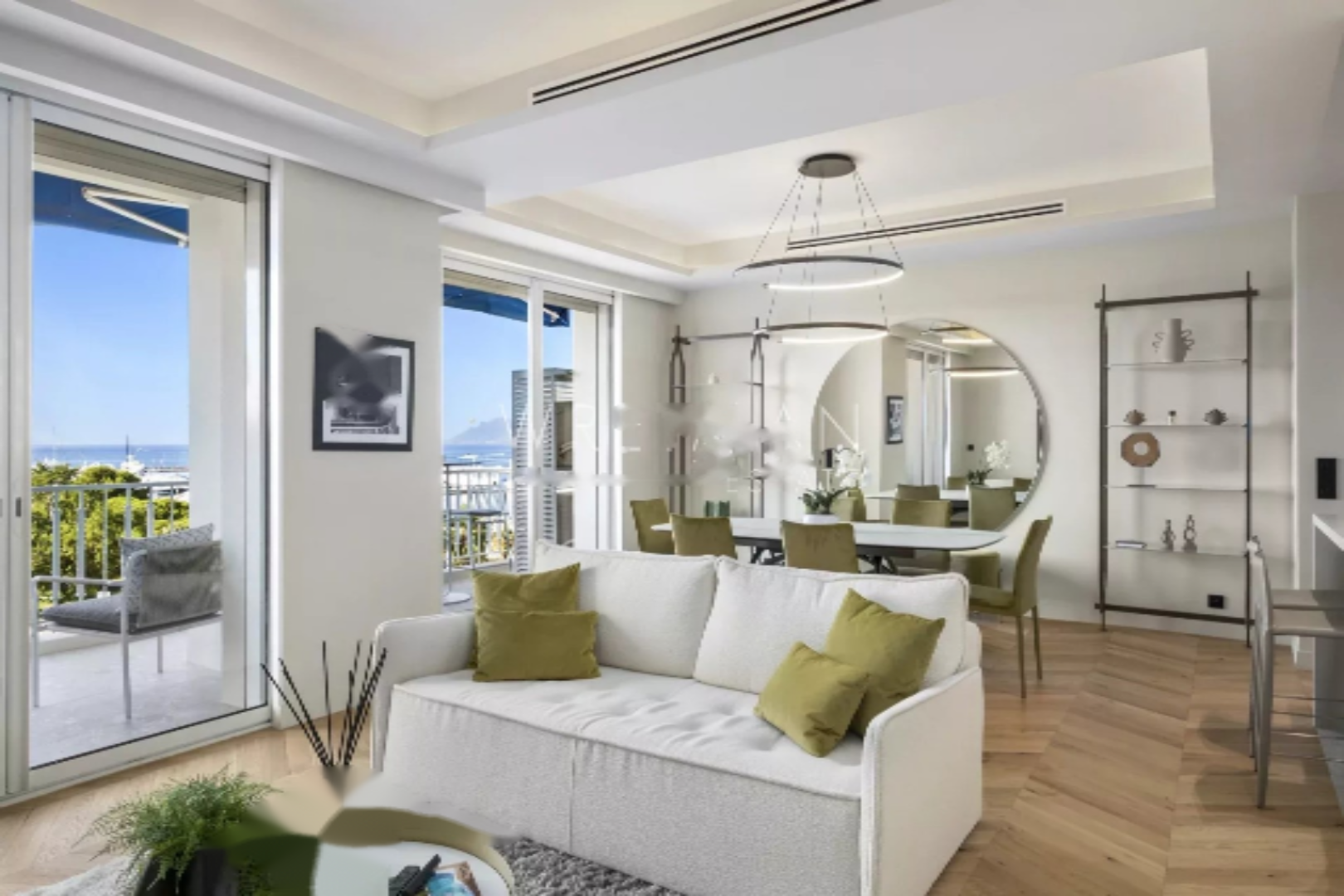️ Гостиная открывается на великолепную террасу с южной экспозицией, предлагая завораживающий вид на море, порт Канто и горный массив Эстерель.