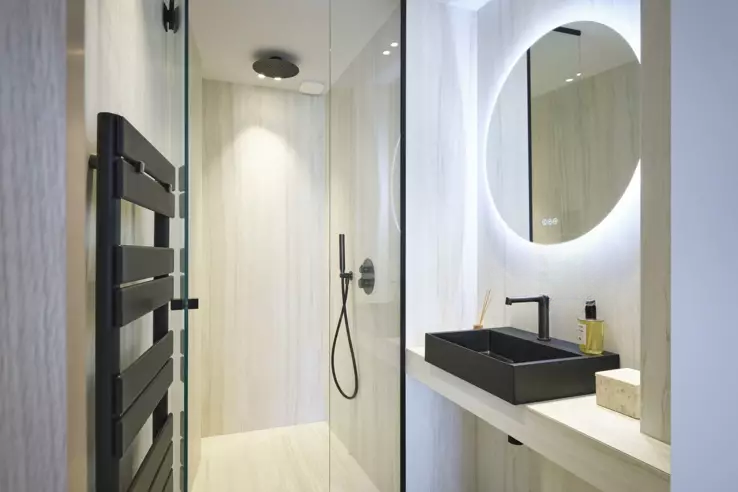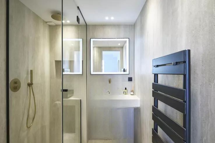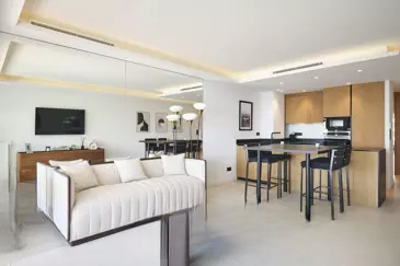 Апартамент состоит из красивой гостиной с открытой кухней, что дает выход на великолепную южную террасу, входной зоны с местами для хранения, двух спален с ванными комнатами, гардеробными и санузлами, гостевого туалета и постирочной зоны.