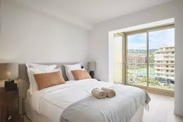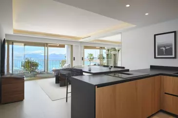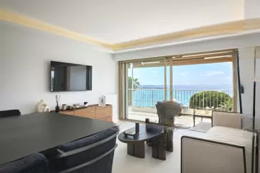 В Каннах, район Croisette - Martinez, на высоком этаже престижной резиденции, расположен этот роскошный сквозной апартамент площадью 70 м², с панорамным видом на море и залив Канн.
