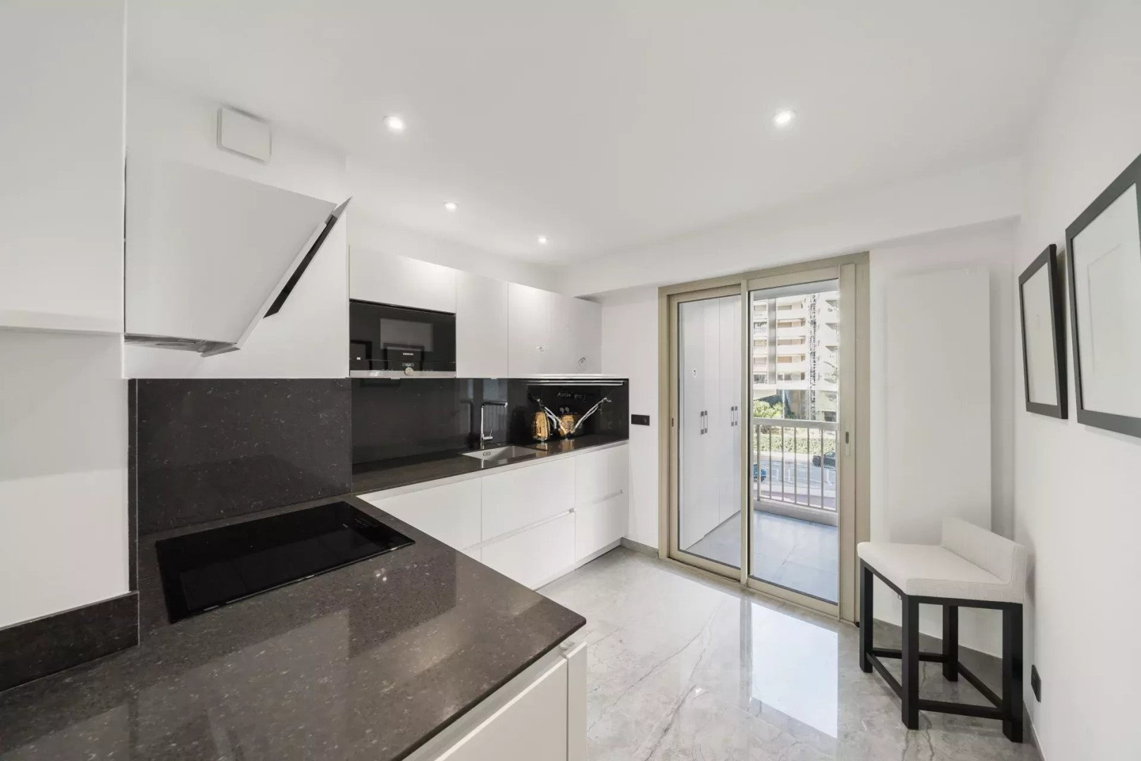 С площадью около 85 м², квартира включает вход, гостиную и столовую, полуоткрытую кухню, спальню с выходом на террасу, ориентированную на юг, с видом на море, просторную душевую с туалетом, вторую спальню с выходом на заднюю террасу, вторую душевую и гостевой туалет.