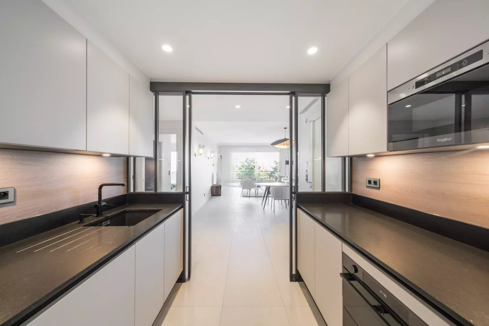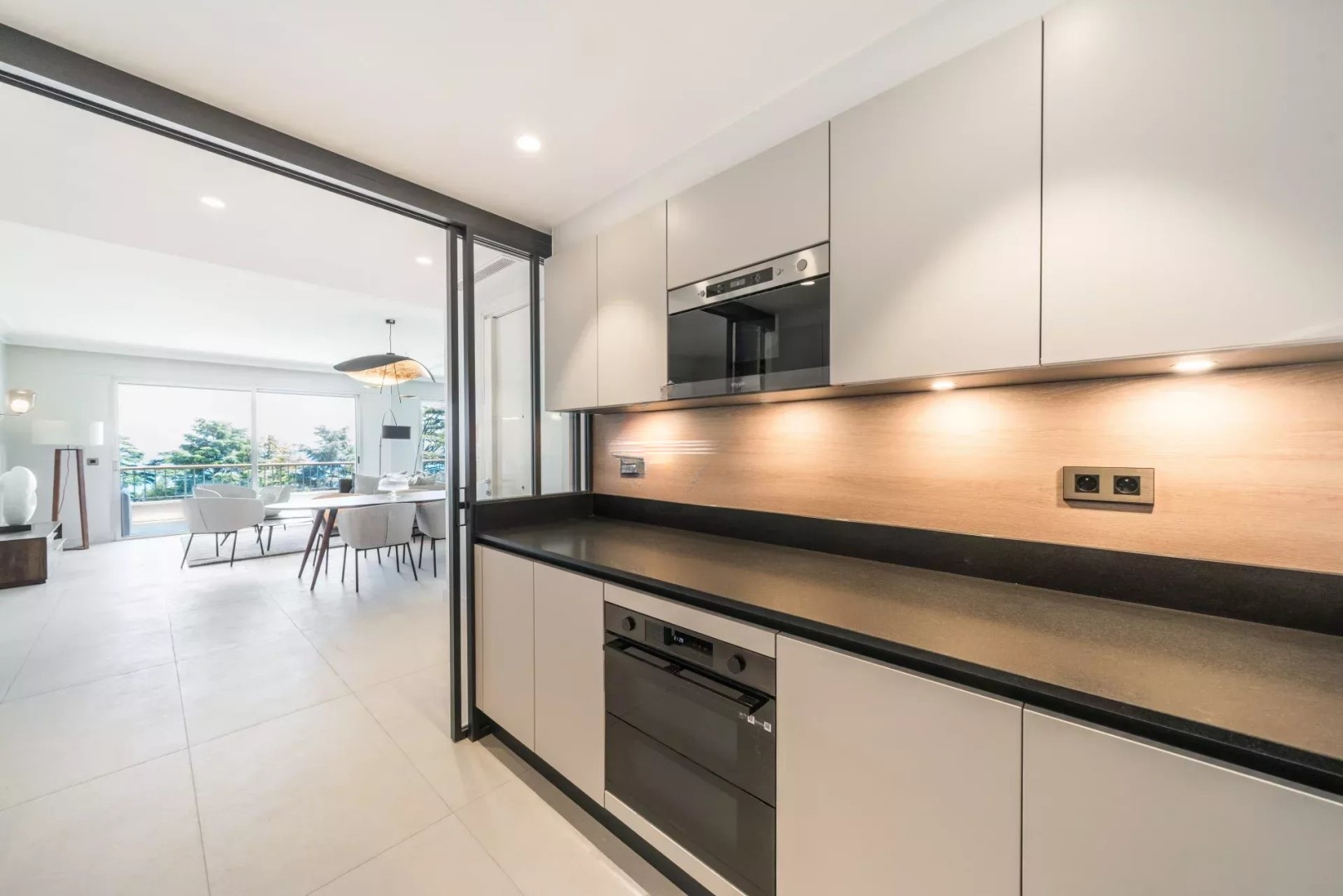 Внутреннее расположение состоит из элегантного входа, открытой полностью оборудованной кухни и светлой гостиной, выходящей на террасу с видом на море, а также главной спальни с видом на море, с большим гардеробом и смежной душевой комнатой. Две другие спальни, ориентированные на север, и еще одна душевая комната завершают это гармоничное жилое пространство.