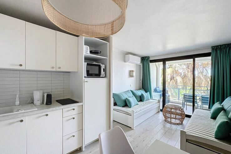 Студия полностью отремонтирована и меблирована, площади 22 кв. м, подходит для проживания до 4 человек. Включает в себя прихожую, гостиную с кухней, спальню, душевую с туалетом. Также имеется просторная терраса.