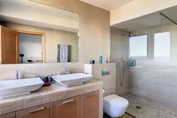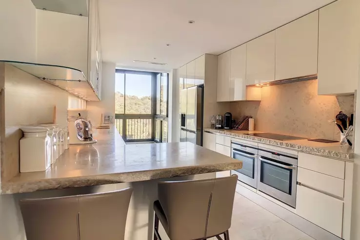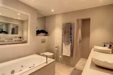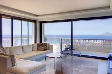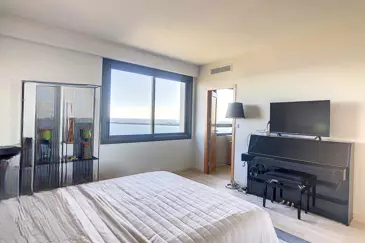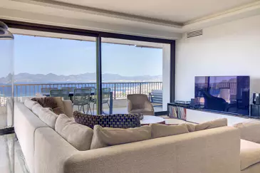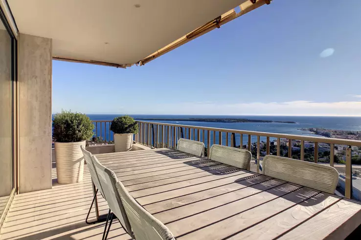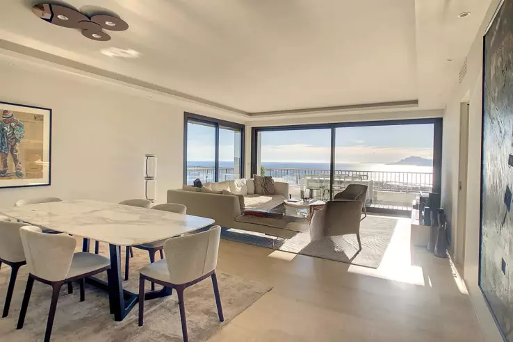 В резиденции высокого уровня в жилом районе La Californie с консьержем, парком и бассейном, великолепная угловая квартира с панорамным видом на море от Cap d'Antibes до St Tropez и с видом на всю бухту Канн. Холл, угловая гостиная, 3 спальни с ванными комнатами, просторная оборудованная кухня с прачечной, гостевой туалет и терраса.