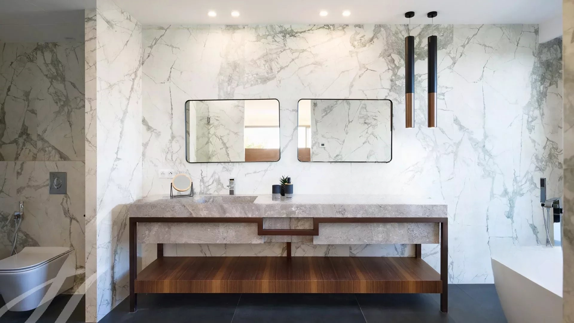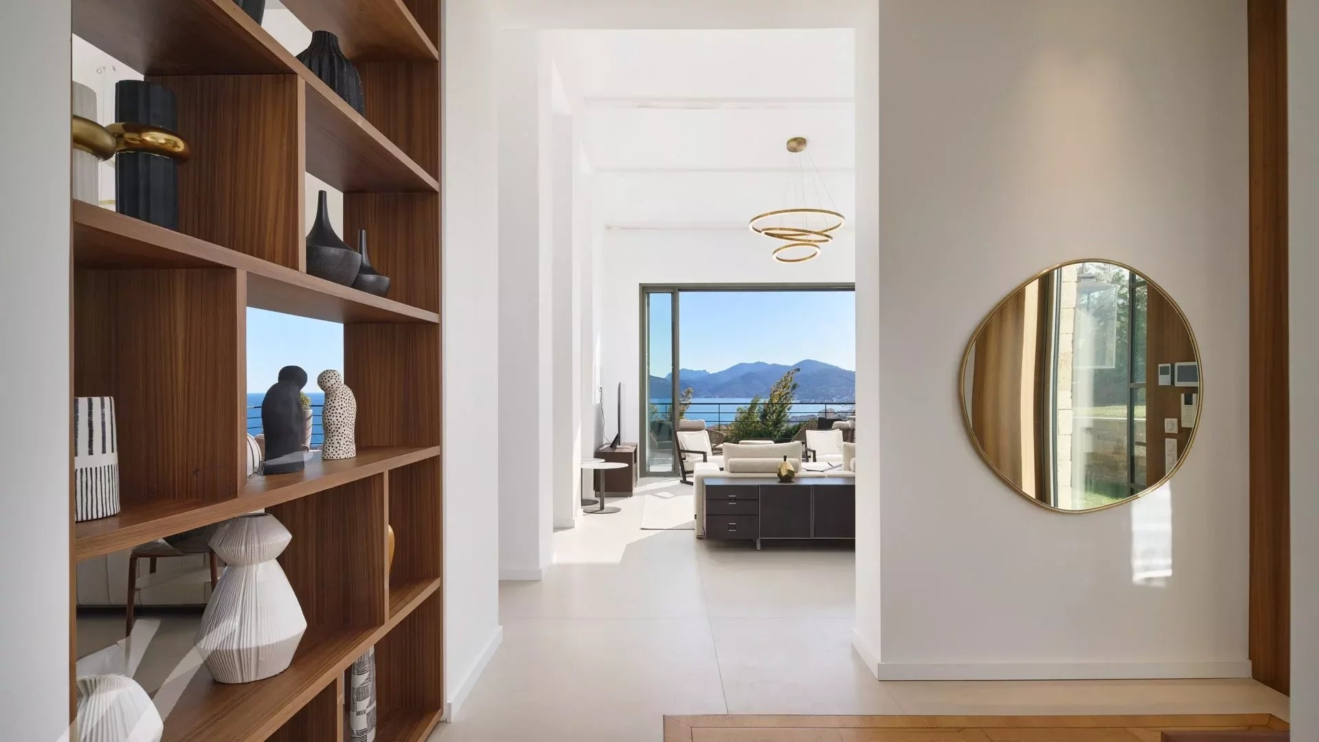 Площадь виллы составляет около 500 м². На этаже расположены вестибюль, большое пространство, включающее двойную гостиную, столовую и американскую кухню, спальню с ванной, гардеробную, душевую и гостевой туалет. На уровне сада находятся столовая и американская кухня, прачечная и отдельные туалеты, три спальни с ванными, а также главная спальня.