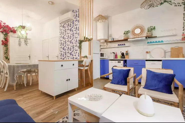 Он включает в себя гостиную, полностью оборудованную кухню, две больших спальни, душевую комнату, отдельный туалет и красивую крытую террасу с видом на небольшой сад.