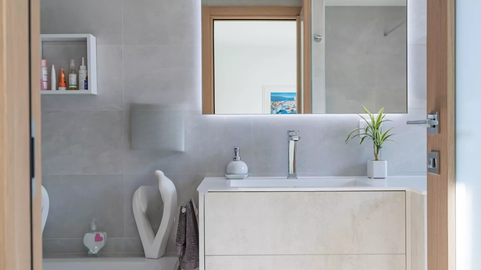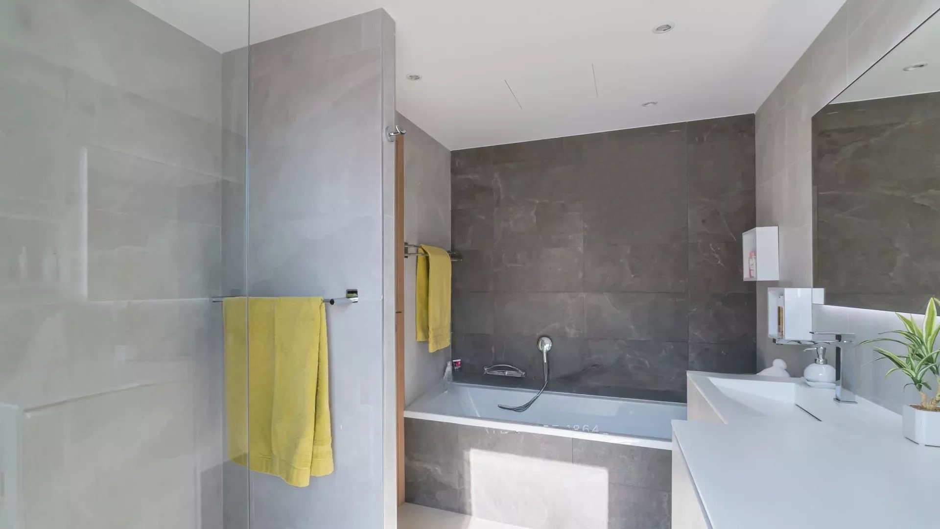 С общей площадью 79 м², квартира оборудована тремя встроенными и независимыми кондиционерами. Включает прихожую с большими шкафами, гостиную с оборудованной американской кухней, которая открывается на террасу, гостевой туалет, спальню с ванной комнатой, дополнительную спальню с душем и туалетом, а также рабочее пространство.