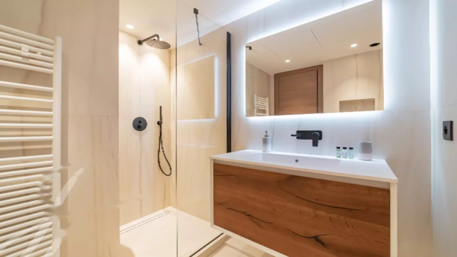 Квартира включает в себя просторную гостиную с открытой кухней, выходящую на террасу с юго-западной экспозицией, а также три спальни с ванными комнатами. Большая терраса площадью 27 м² позволяет в полной мере насладиться великолепным видом на море.