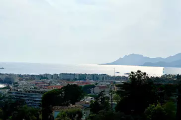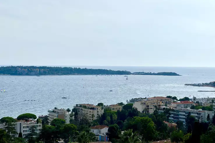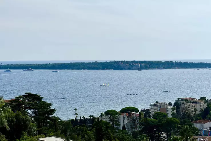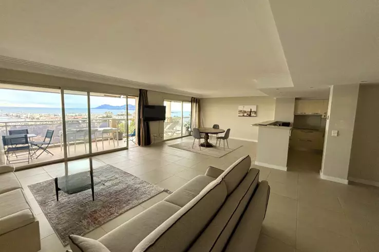 CALIFORNIE - В одной из самых престижных охраняемых резиденций района, с большим парком, бассейном и теннисным кортом, светлая квартира на последнем этаже с панорамным видом на море, остров Лерин и залив Канн.