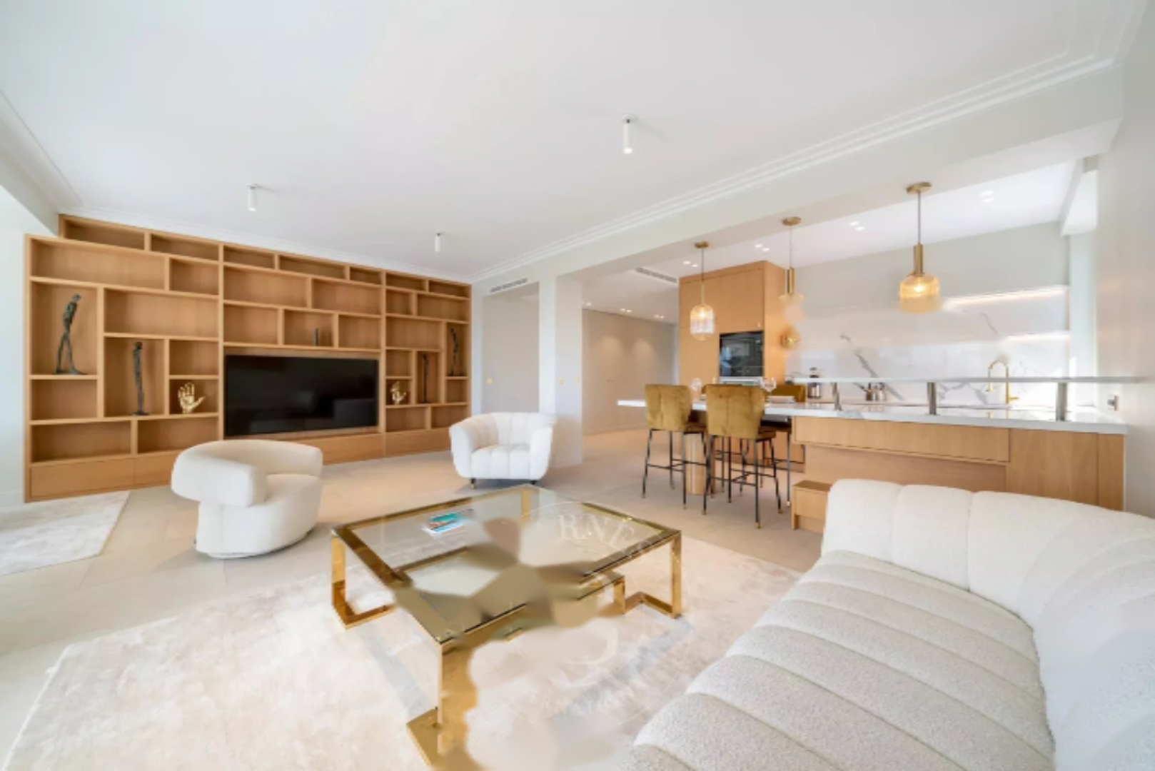 Квартира включает вход, полностью оборудованную кухню, совмещённую с гостиной/столовой, выходящей на две красивые террасы с видом на море и зелёные насаждения.