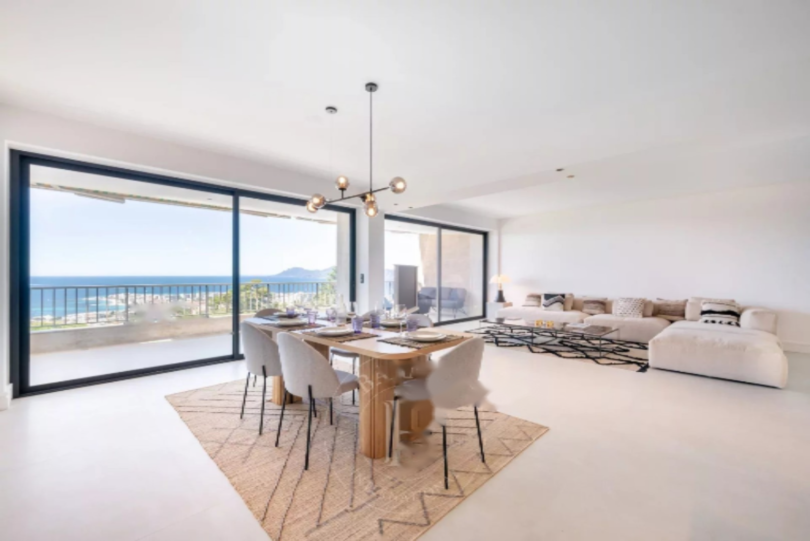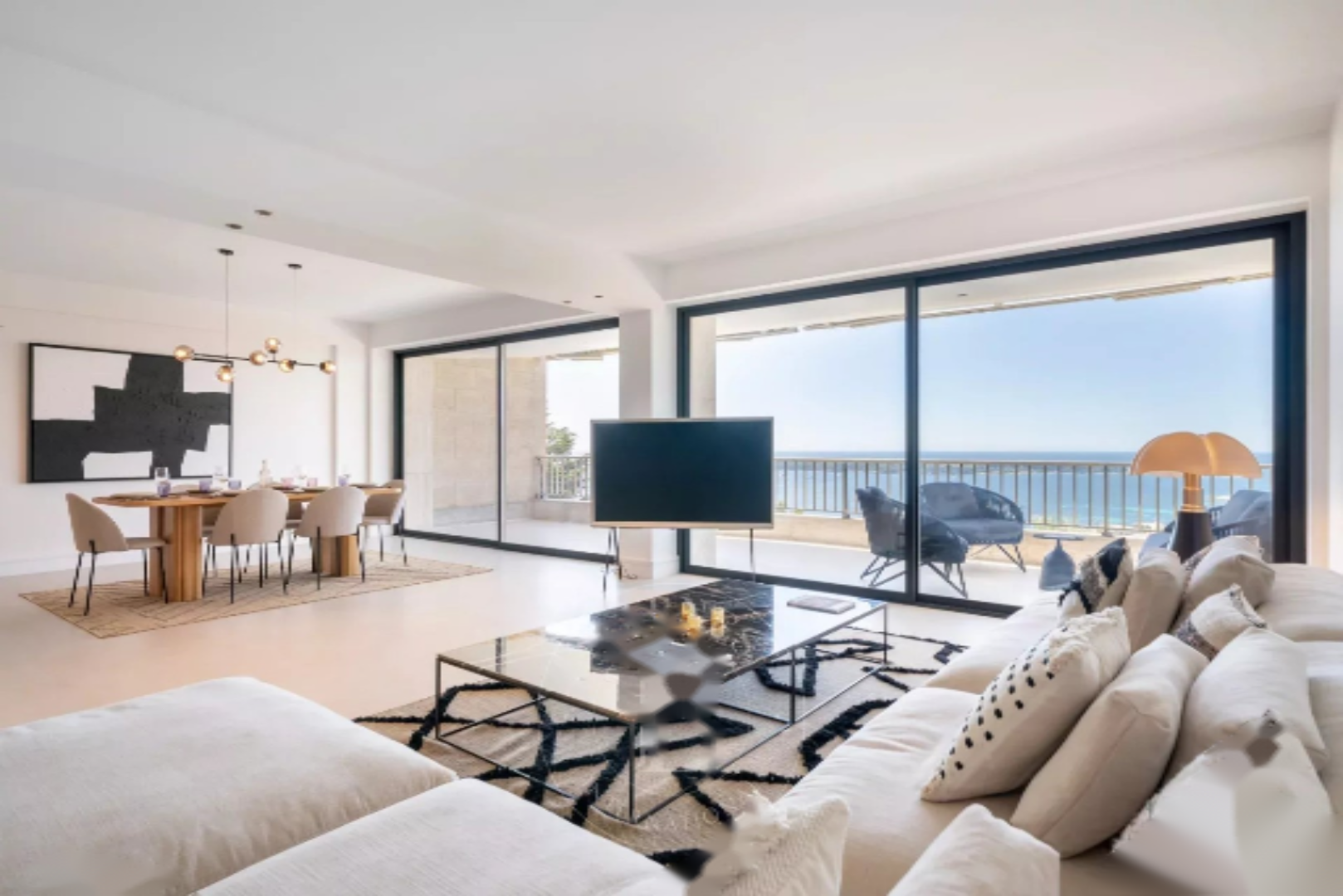 В него входит просторная светлая гостиная со столовой и полностью оборудованной американской кухней, которая ведет на террасу с видом на море, а также 2 спальни с ванными комнатами, в том числе одна мастер-спальня.