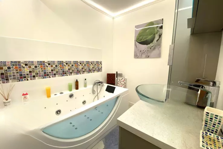 Две спальни с ванными комнатами, ванные с гидромассажем и душевой. Множество мест для хранения, подвал 9м² с окном (можно переоборудовать в спальню с водоснабжением) и выделенное парковочное место.
