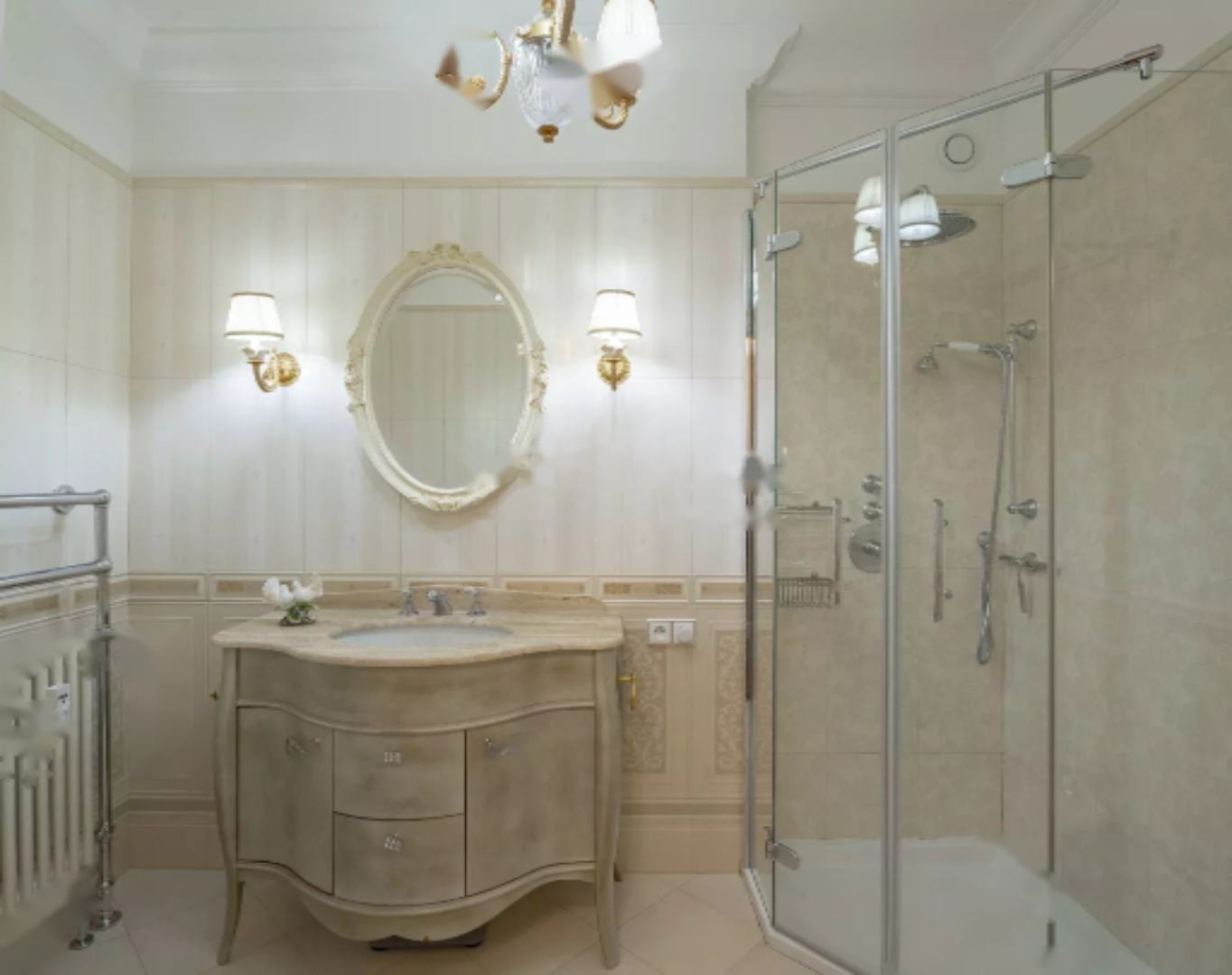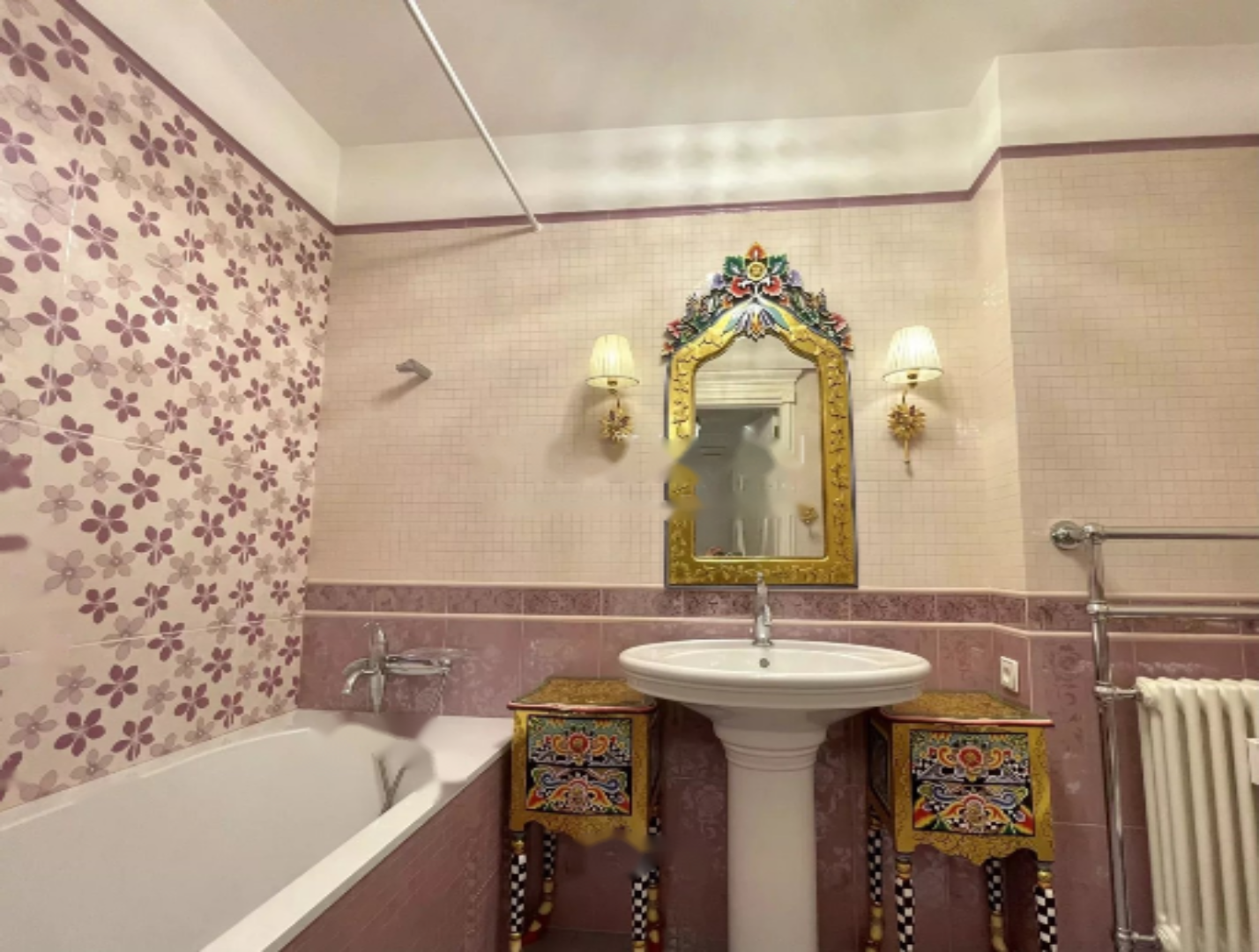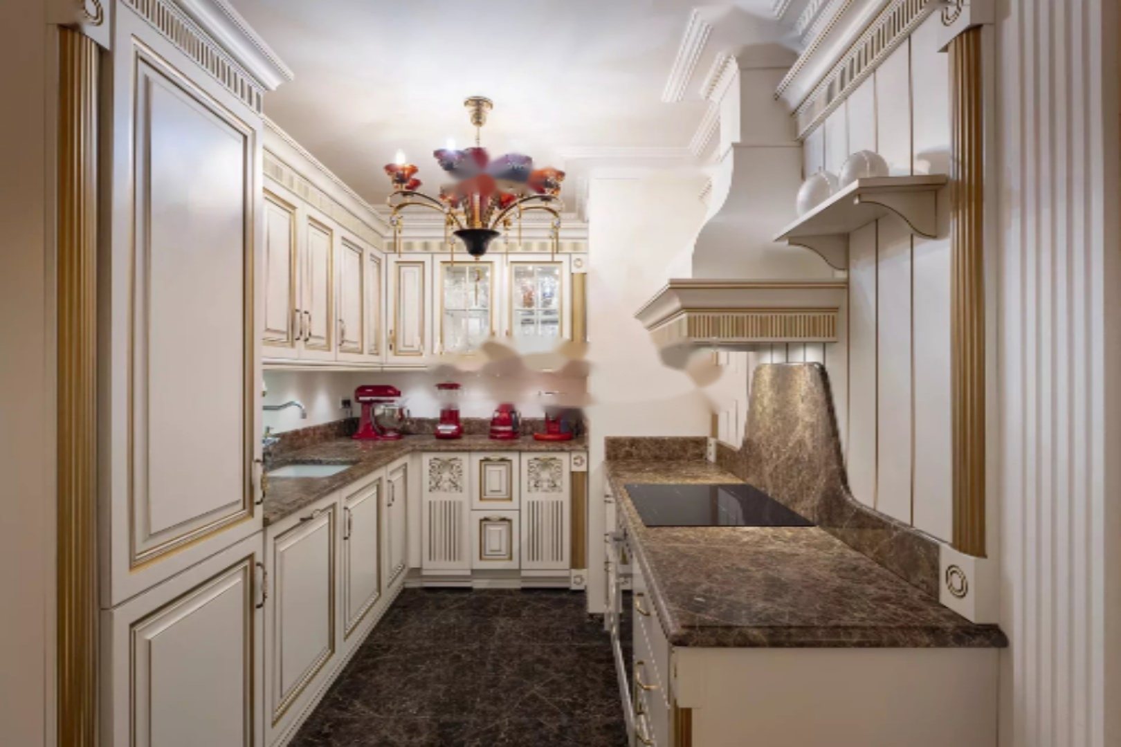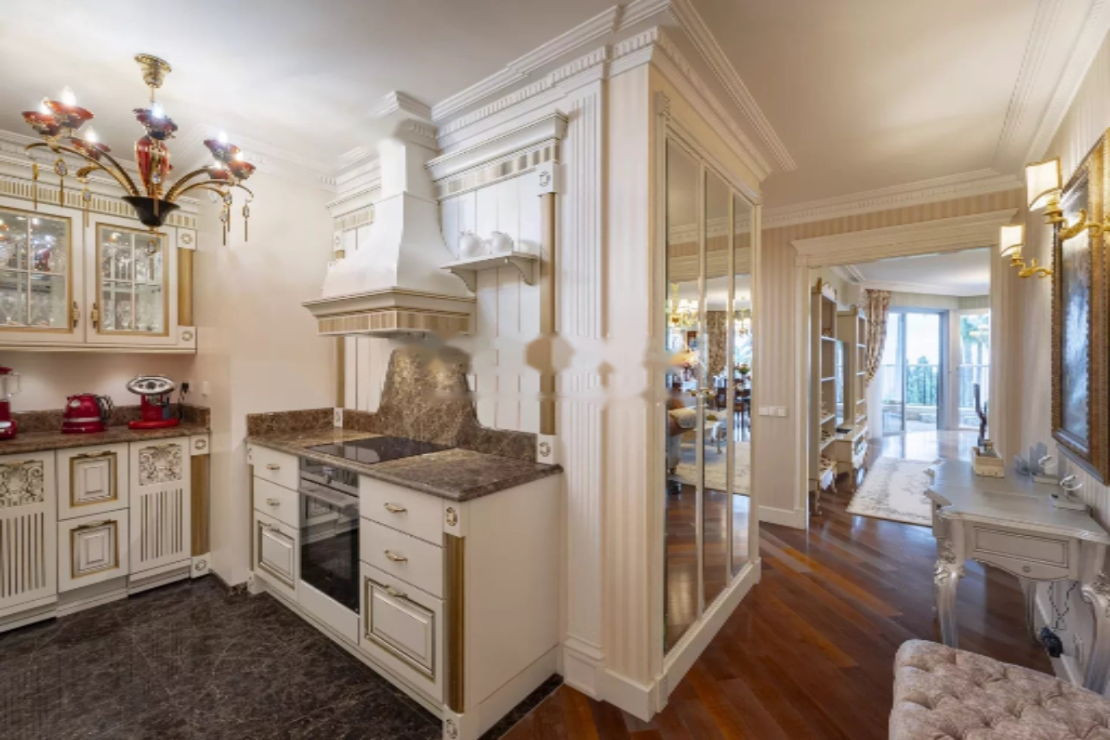 Квартира включает в себя просторную прихожую, полностью оборудованную на заказ кухню, светлую гостиную, главную спальню с гардеробной и смежной ванной комнатой, две другие спальни, лоджию, душевую комнату, прачечную и гостевой туалет.