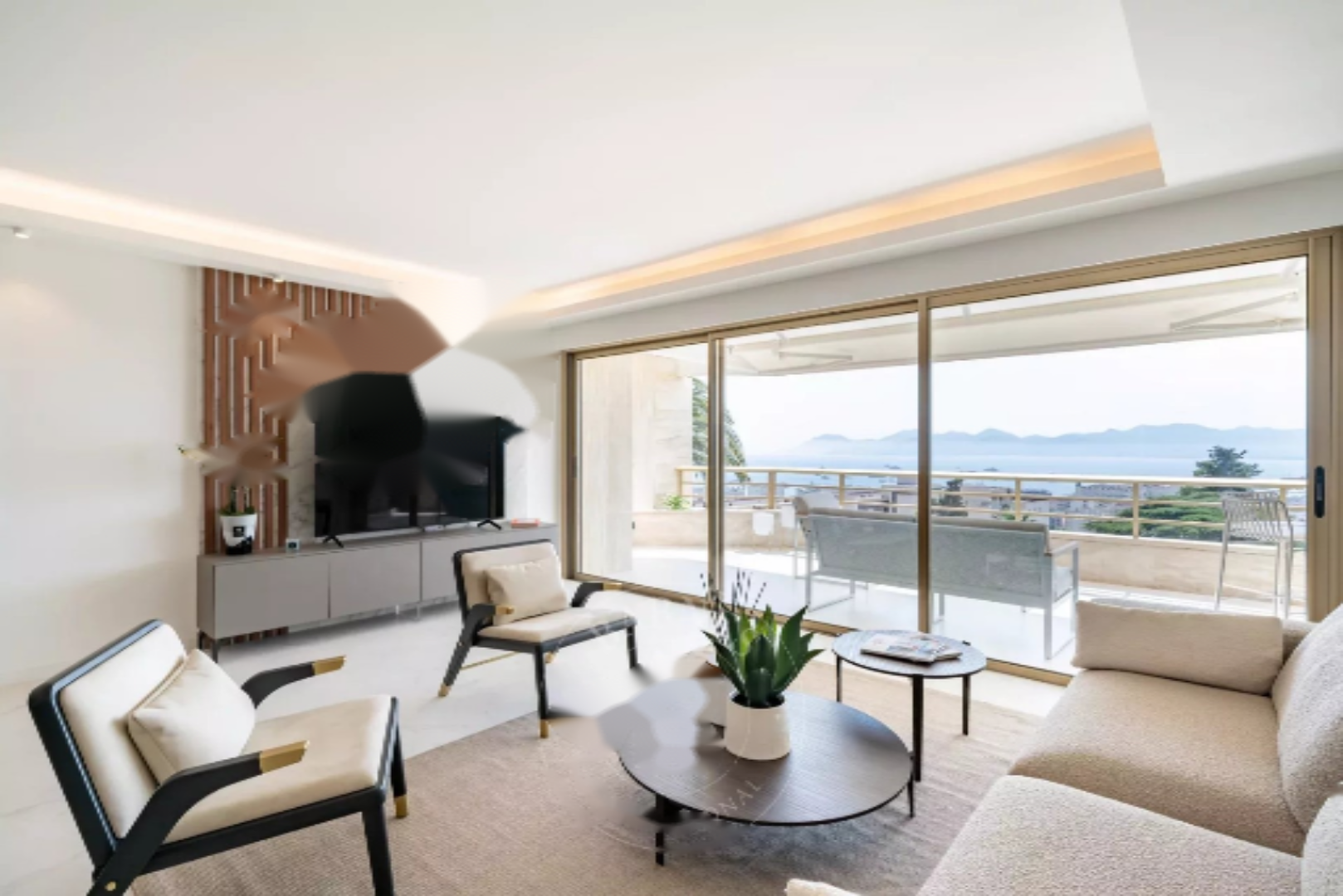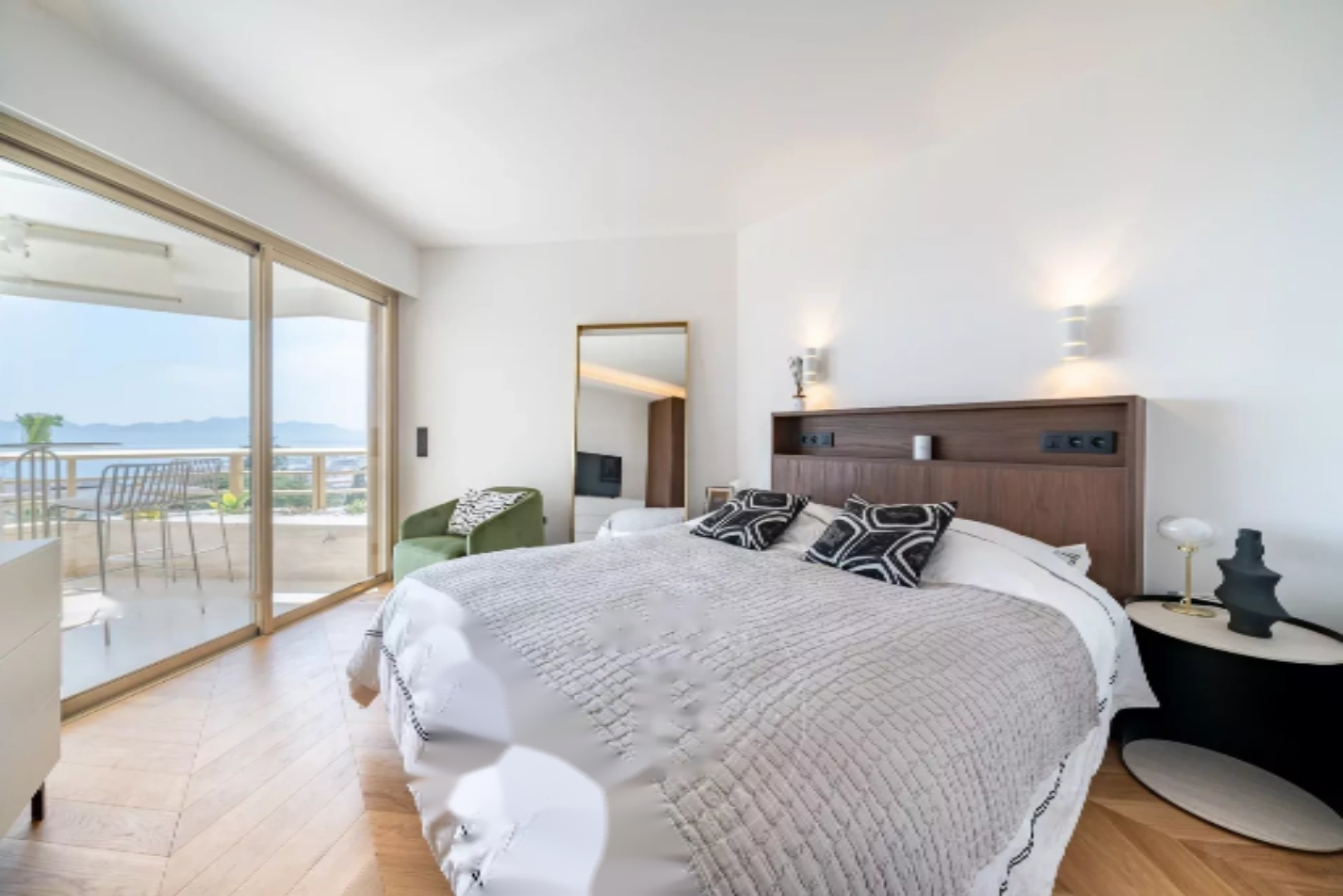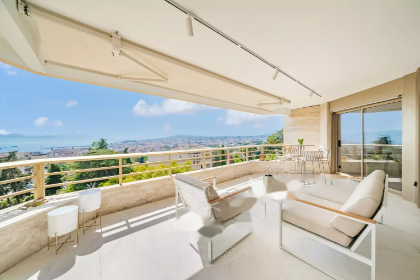 Канны, район Басс-Калифорни, в роскошной охраняемой резиденции с консьержем, красивым садом и крытым бассейном, очень красивая квартира с панорамным видом на море, на высоком этаже площадью 92 м², дополненная прекрасной и глубокой террасой площадью 28 м².