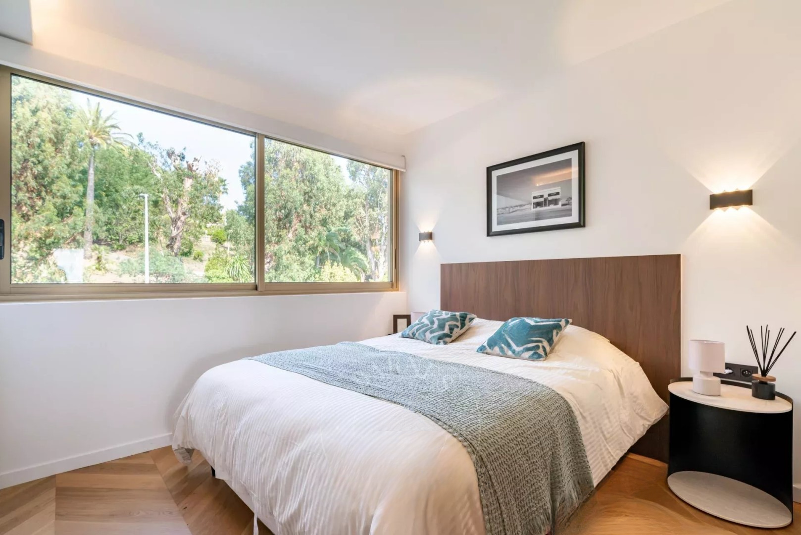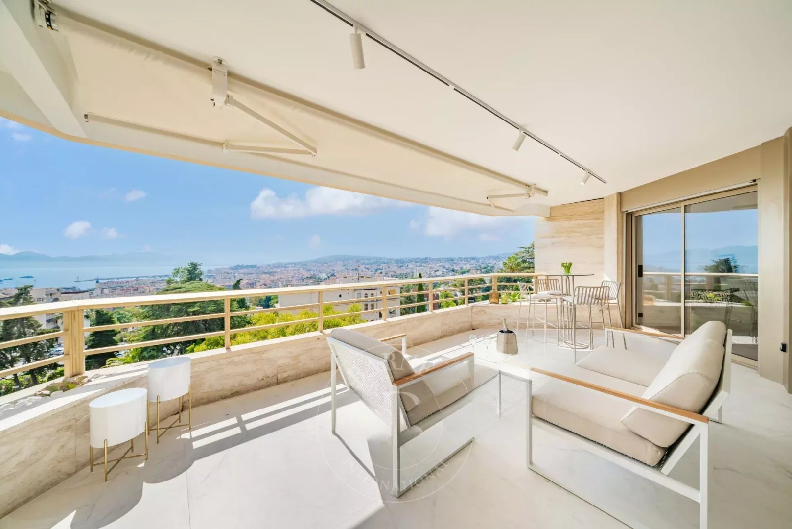 Канны, район Басс Калифорни, в роскошной охраняемой резиденции с консьержем, прекрасным садом и крытым бассейном, очень красивая квартира с панорамным видом на море, на высоком этаже, площадью 92 м² и с глубокой террасой площадью 28 м².