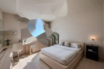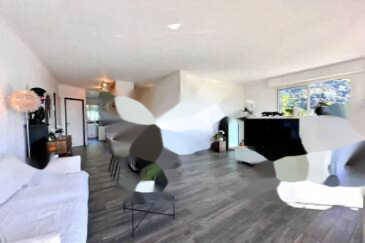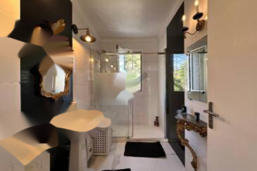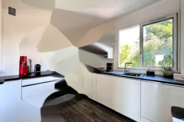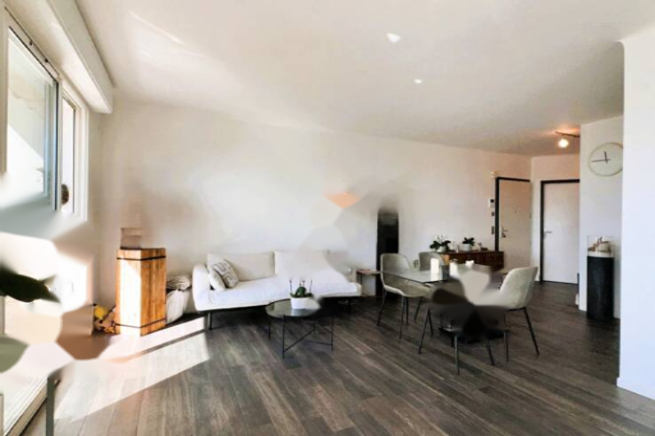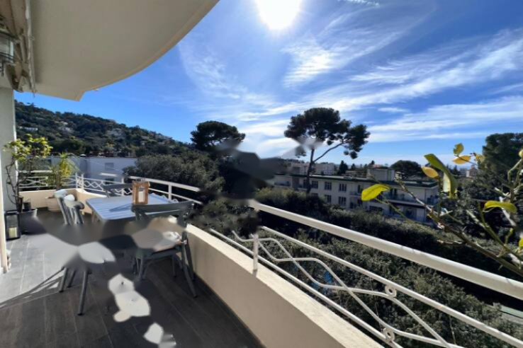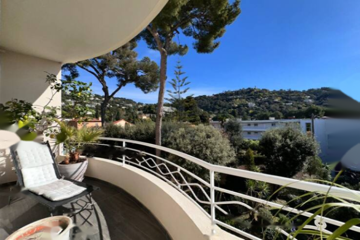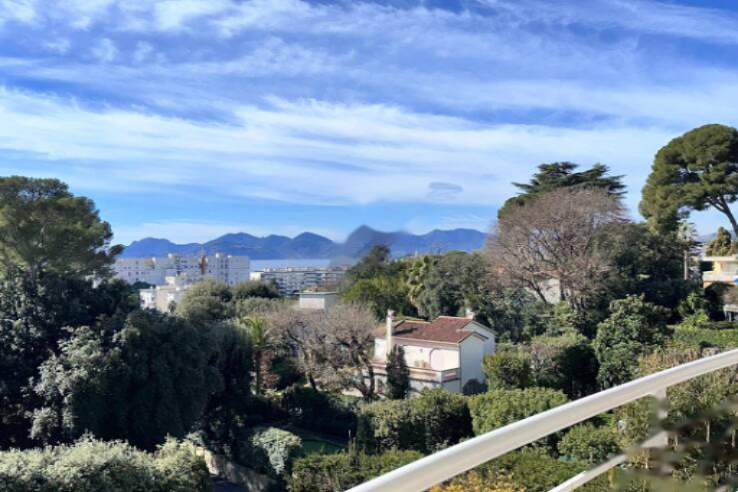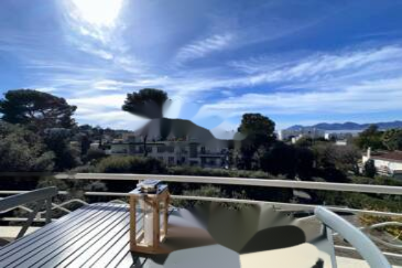 Помещение включает в себя вход с кладовой, который ведет в двойную гостиную с угловой террасой, откуда открывается вид на зелень, море и Эстерель, две большие спальни с встроенными шкафами и второй угловой террасой, ванную комнату с душем, кухню и отдельный туалет.