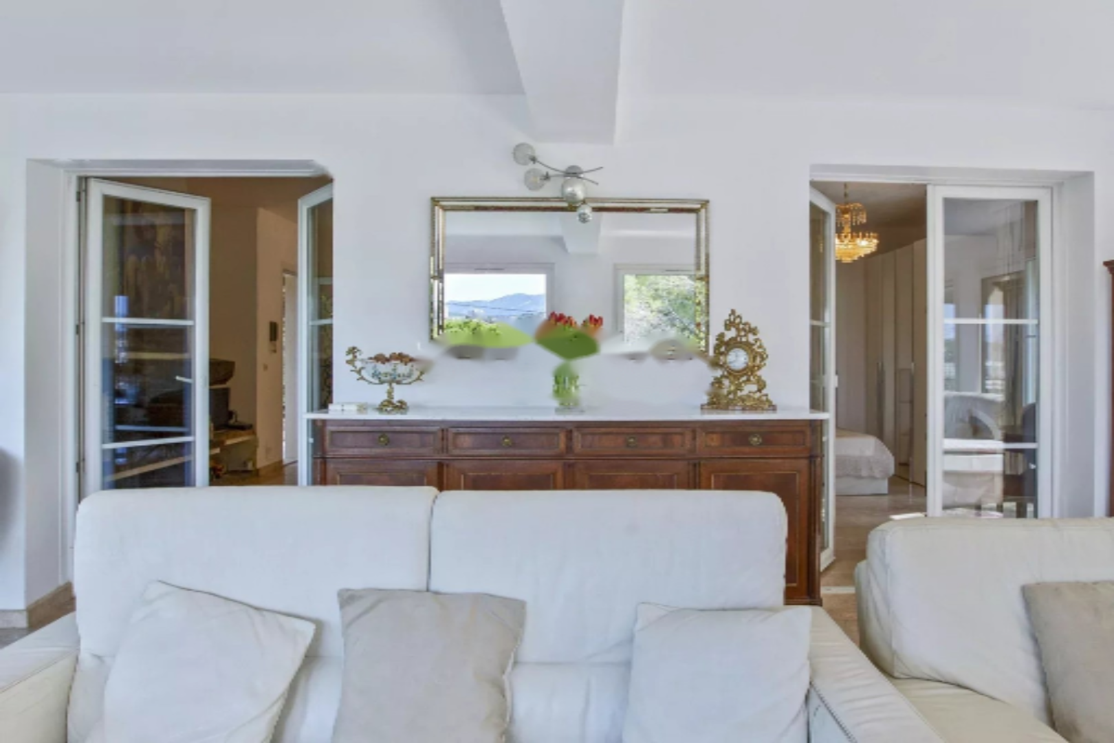 Недвижимость располагается на трех уровнях. На садовом уровне находится независимая квартира, идеально подходящая для гостей или сдачи в аренду. На основном этаже расположена светлая гостиная площадью 53 м², выходящая на затененную террасу, независимая кухня и три спальни, две из которых с приватными ванными комнатами и доступом к большой панорамной террасе площадью 53 м².