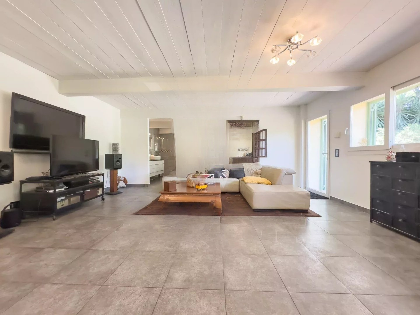 Первая дом, требующий ремонта, занимает 95 м² на трех уровнях. Он включает гостиную/столовую, кухню и три спальни.