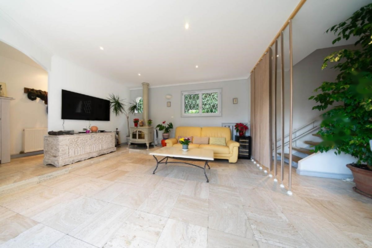 На уровне сада расположен светлый зал, отдельная кухня, туалет и прачечная, а также прекрасная терраса с южной ориентацией и садом около 50 м² с юго-западной экспозицией.