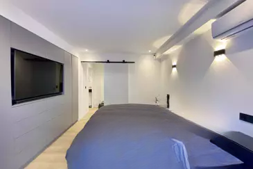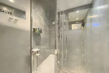 Просторная спальня с ванной комнатой оборудована встроенной гардеробной, современной душевой и туалетом.