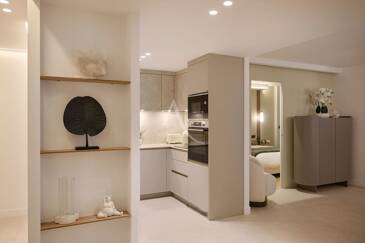 Жилая зона включает просторную гостиную, залитую светом, которая переходит в открытую высококлассную кухню, полностью оборудованную, идеальную для приема гостей.