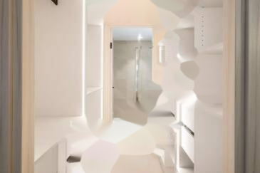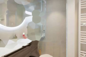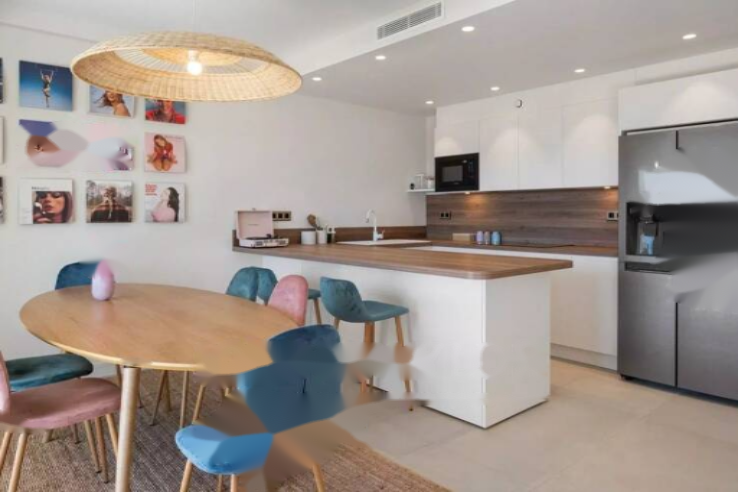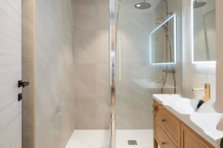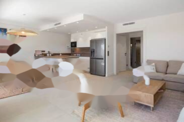 Площадью 77,57 м² по закону Carrez, она включает в себя вход, гостиную с открытой кухней, основную спальню с гардеробной и душевой комнатой с туалетом, вторую спальню, а также вторую душевую комнату с туалетом.