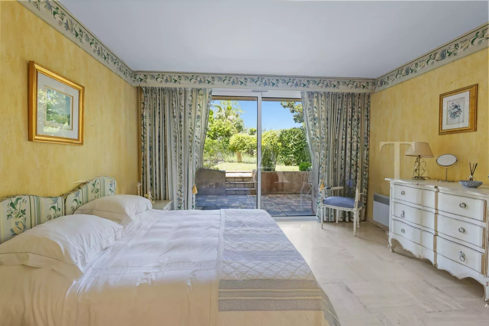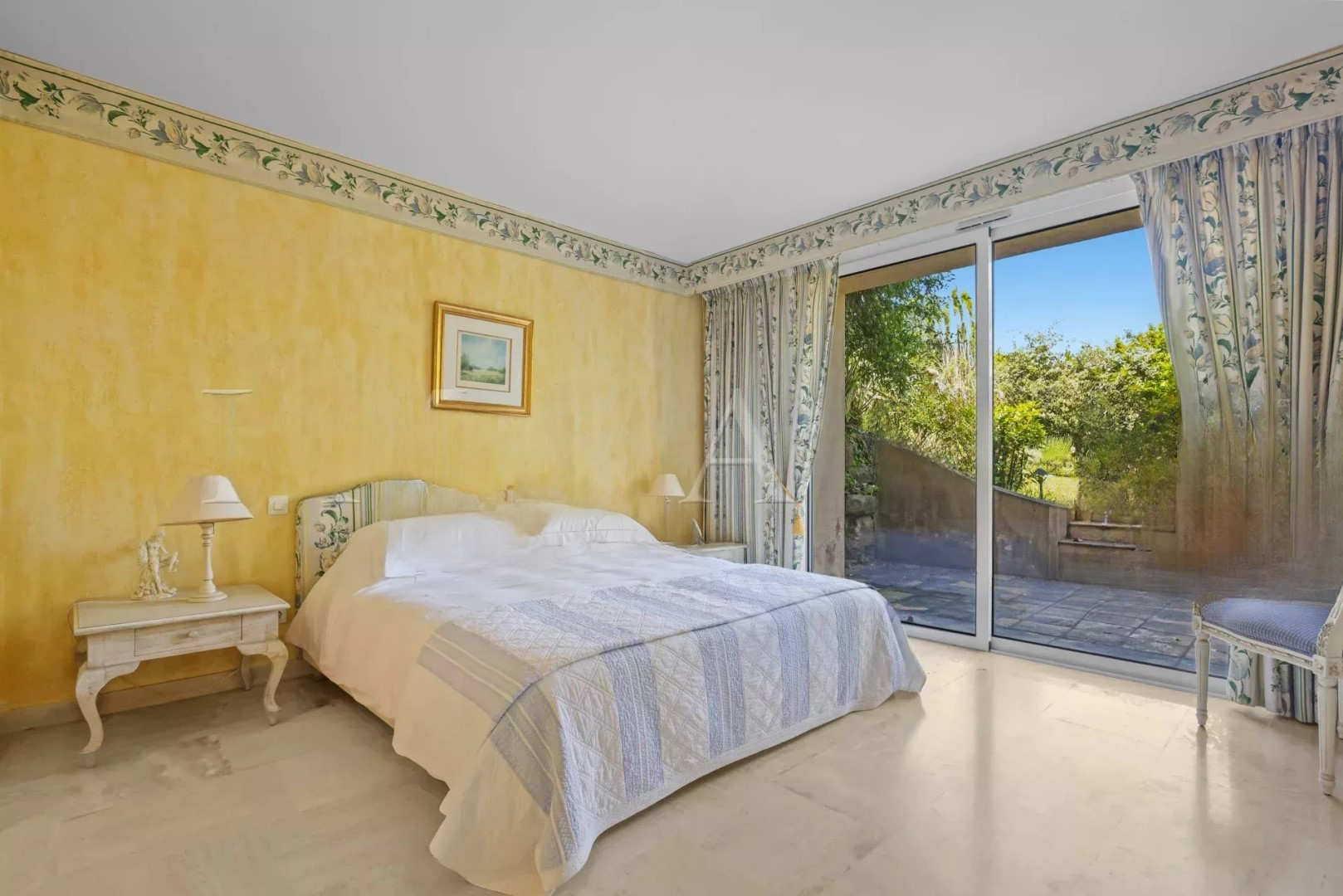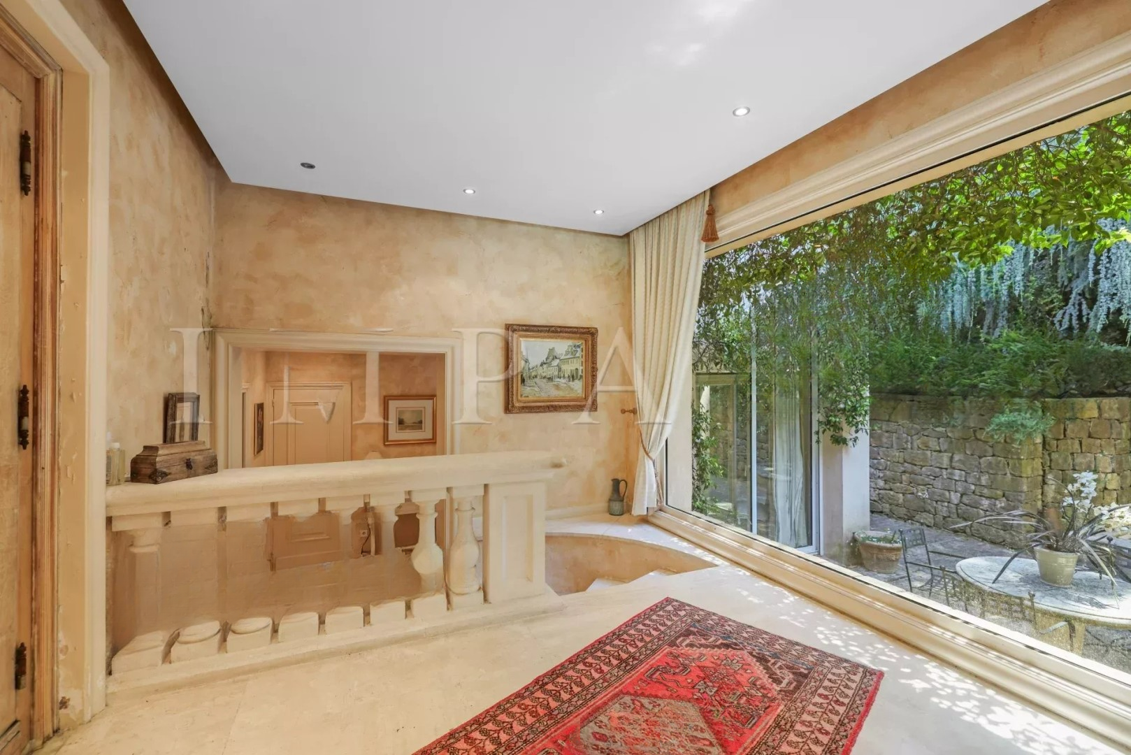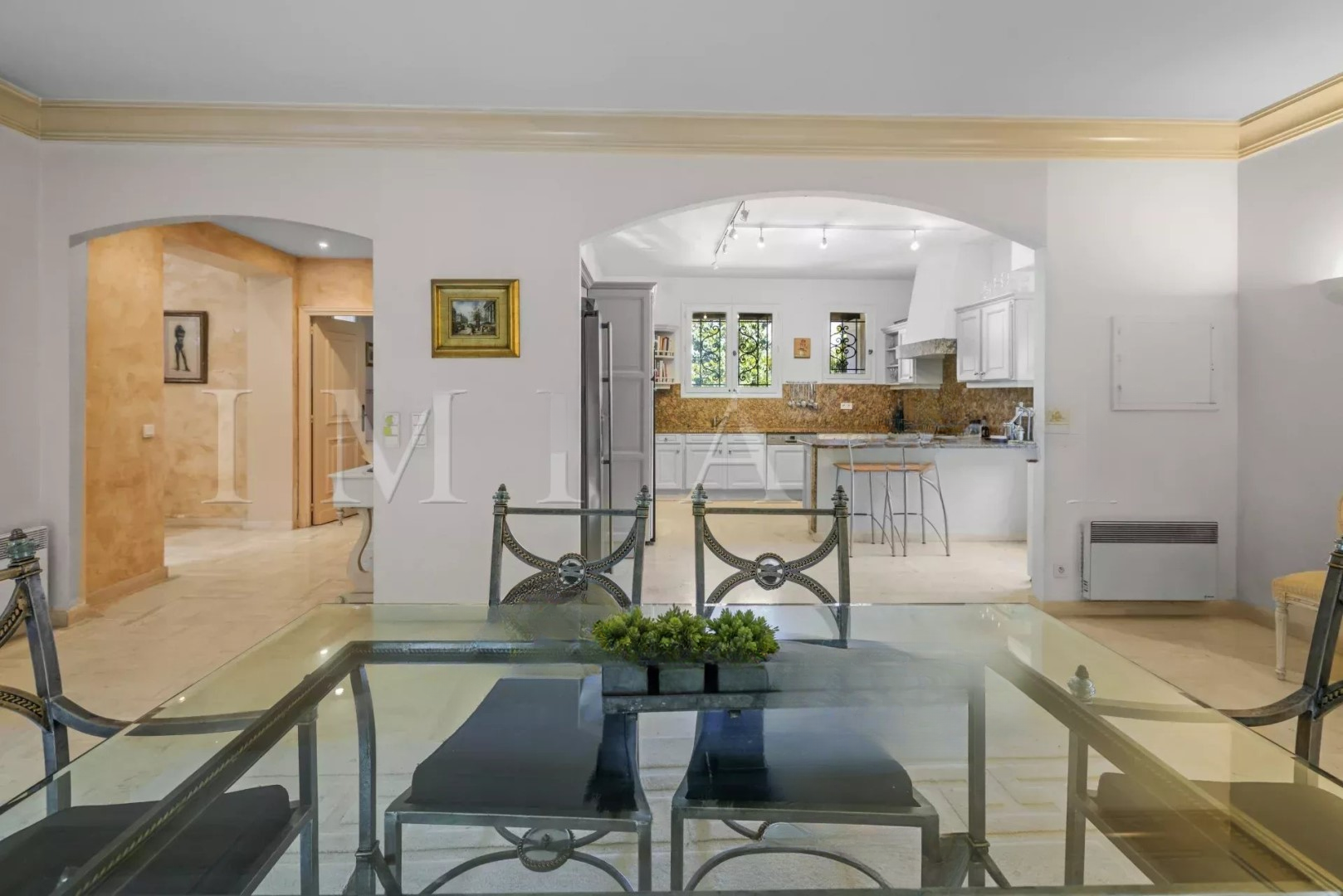 На первом этаже находится вестибюль, открывающийся на очаровательный патио. Просторная и теплая двойная гостиная с прямым выходом на террасу и к бассейну. Главная спальня с гардеробной и ванной комнатой имеет террасу с видом на сад. Кухня оборудована и открывается в столовую с видом на патио.