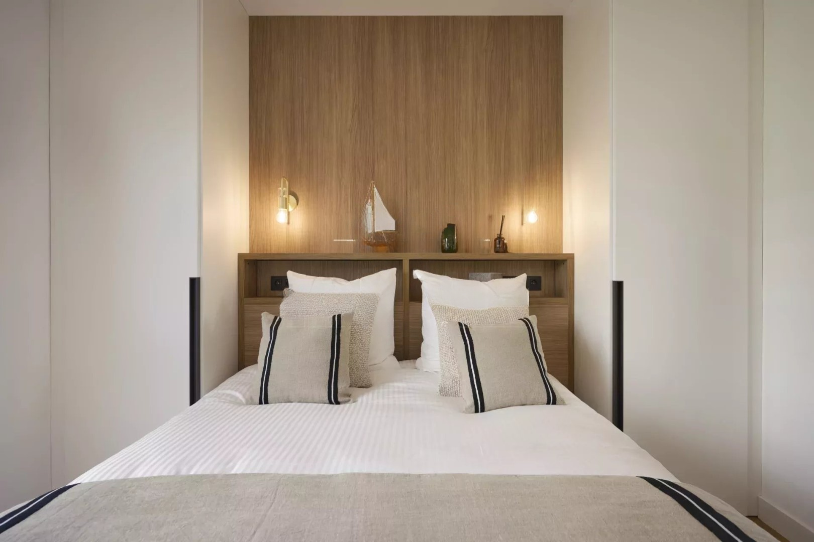 Квартира состоит из светлой гостиной с полностью оборудованной открытой кухней, двух спален с ванными комнатами и террасы 8 м², обращенной на юг, что идеально подходит для полного наслаждения каннским климатом.