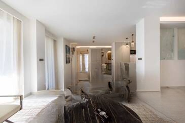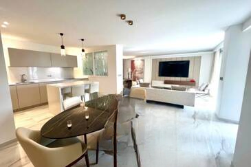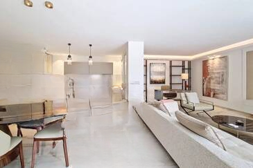 Сразу при входе пространство преображается в обширную гостиную, залитую светом, с великолепной террасой, ориентированной на юг и с видом на море. Открытая кухня, элегантно и ненавязчиво интегрированная, также имеет утонченный рабочий уголок.