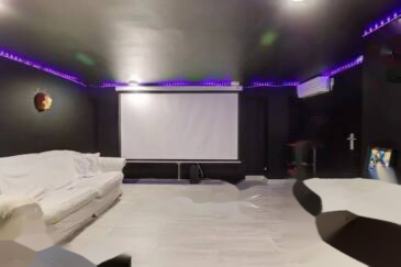На уровне сада расположены спальня, душ, кинозал и гостиная с кухней.