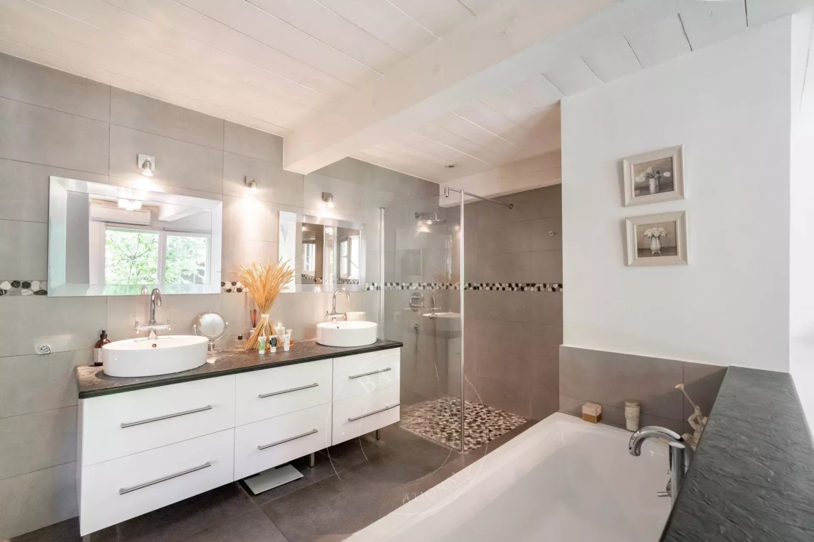 Второе здание, полностью обновлённое, включает просторную гостиную площадью 40 м² с открытой кухней, спальню 15 м² с ванной комнатой, а также прямой выход на затенённую террасу и в сад. Гараж на 20 м², два мастерских и резервуар для сбора дождевой воды на 20 000 литров, идеальный для полива, дополняют эту редкую недвижимость.
