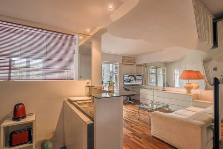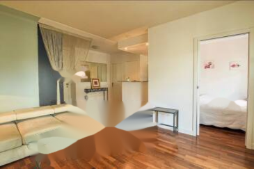Эта квартира расположена в 1 км от центра города Канн, дворца фестивалей, вокзала и пляжей. В ней находится просторная гостиная с небольшой обустроенной открытой кухней площадью 27 м². Ванная комната и отдельный туалет. Спальня с встроенным шкафом и французской дверью, выходящей на террасу.
