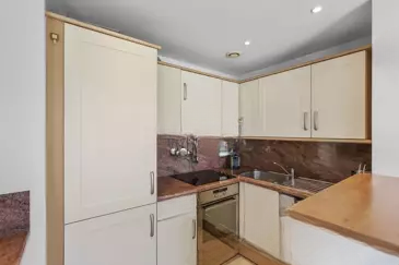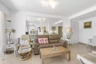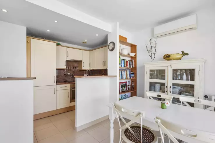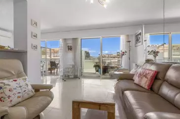 В квартире две спальни: главная спальня с собственной ванной комнатой и туалетом, а также вторая, более маленькая, спальня с ванной комнатой и отдельным туалетом. Светлое жилое пространство, ориентированное на запад, включает в себя кухню американского типа, открывающуюся на открытую террасу с очень красивым боковым видом на море — идеально, чтобы насладиться полуденным солнцем, поужинать на свежем воздухе или выпить аперитив.