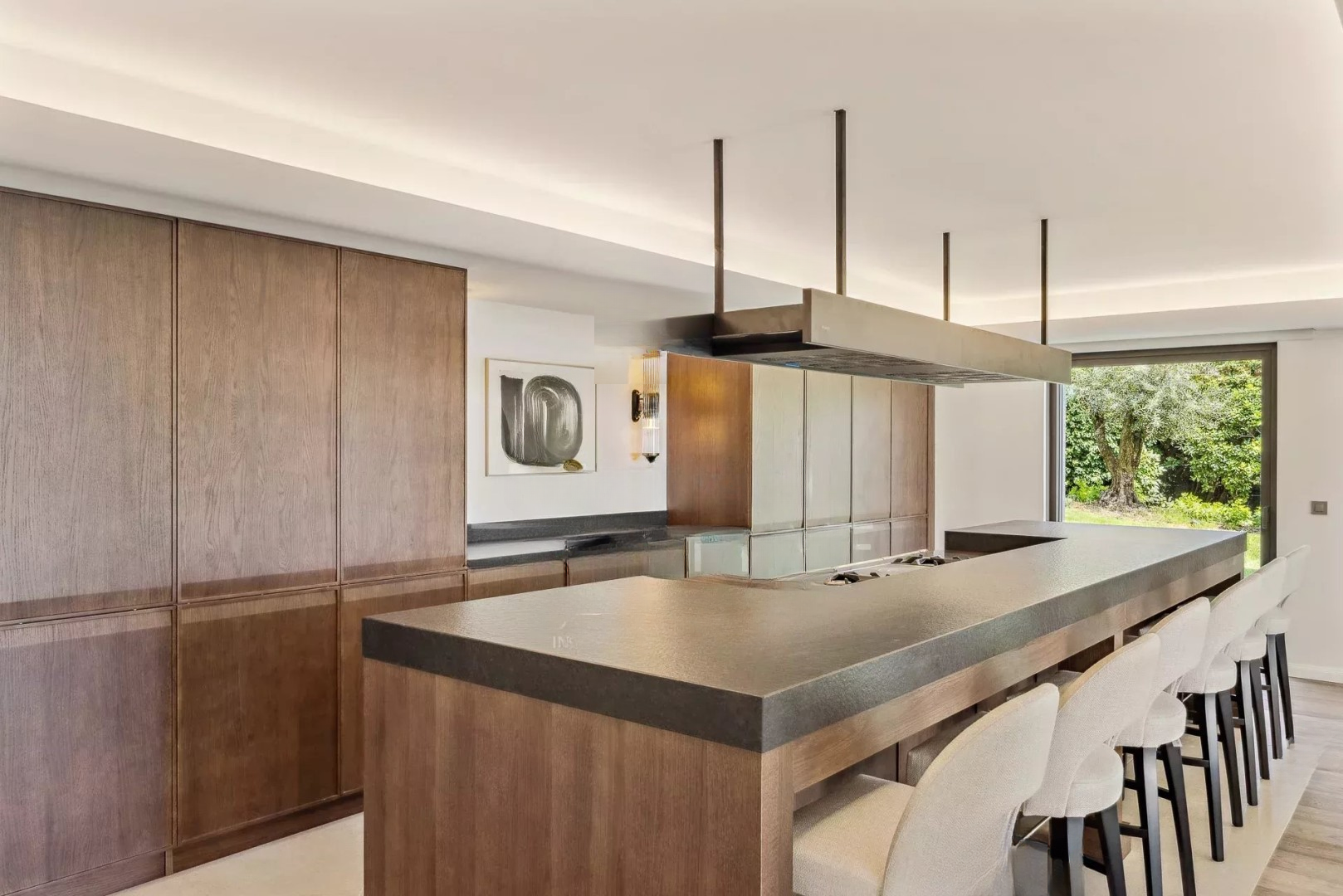В доме представлены пять просторных спален с ванными комнатами, светлые интерьеры и уютная, утонченная атмосфера. В центре дома находится просторная семейная кухня, которая открывается на большие приемные зоны, соединенные с террасами и садом.