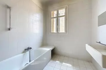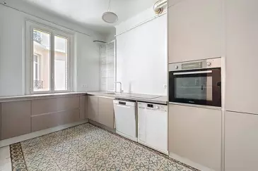 Район Saint Nicolas, низ Карно, улица Моцарт. В хорошем состоянии, здание в стиле ар-деко с обновленным фасадом. На втором этаже красивое пятикомнатное жилье площадью 117 м², включает в себя холл, ведущий в просторную гостиную, три спальни, одна из которых с душем, отдельную кухню, ванную комнату, отдельный туалет и балкон. В дополнение есть подвал.