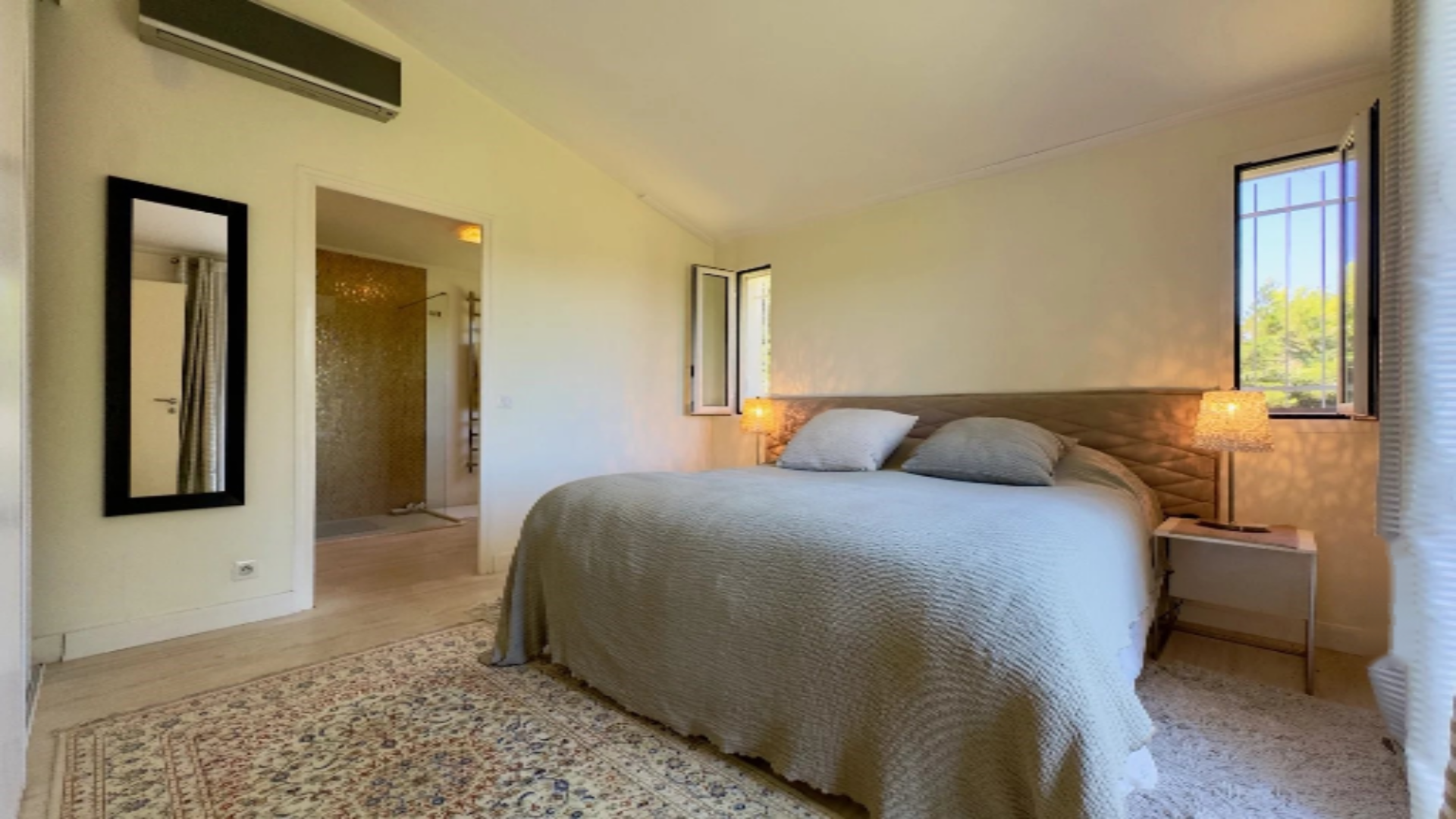 Главная спальня включает в себя собственную ванную комнату и отдельную террасу с потрясающим видом на окрестности. Три дополнительных спальни, две ванных комнаты, просторный гардероб, прачечная и кладовая дополняют ночную зону.