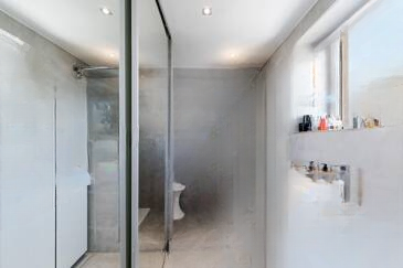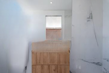 По скульптурной стеклянной лестнице поднимаемся на верхний этаж, где располагается вторая спальня или кабинет, душевая с туалетом и уголок для прачечной.