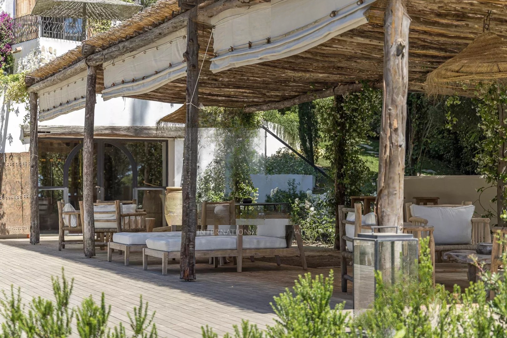 Особое внимание было уделено открытым пространствам с большим бассейном и домиком у бассейна, на участке площадью около 4500 м², в основном плоском, засаженном средиземноморской растительностью, чьи яркие цвета блистают на белизне фасада.