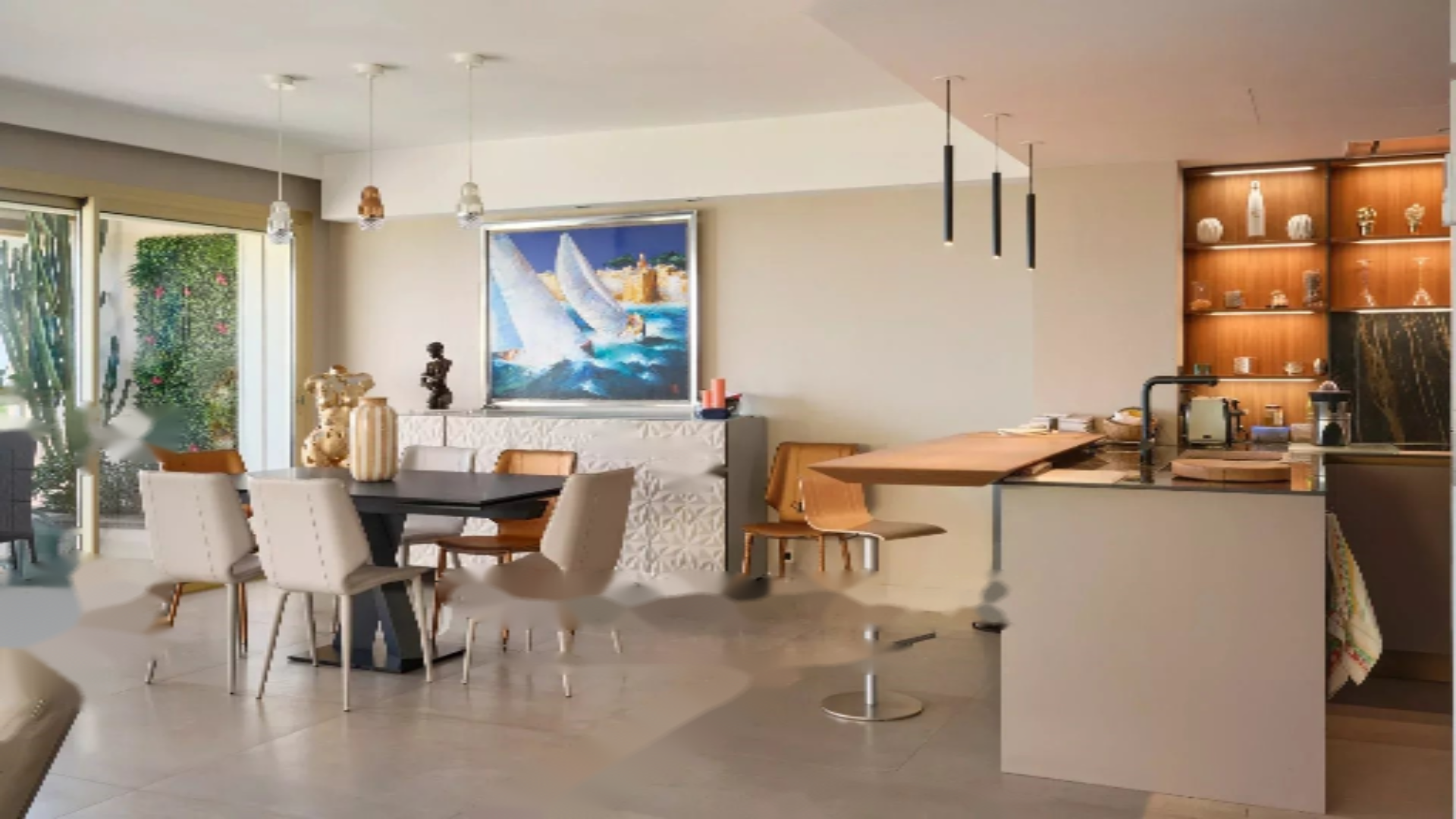 Квартира включает в себя: красивую и просторную гостиную с зоной столовой и американской кухней, все открывающееся на террасы с видом на море. Гостевой туалет / прачечная (стиральная и сушильная машины). Спальная главная с выходом на основную террасу, полноценная ванная комната. Одна спальня с рабочим уголком и собственной душевой/WC, одна спальня с душевой, отдельная комната с душевой на нижнем этаже.