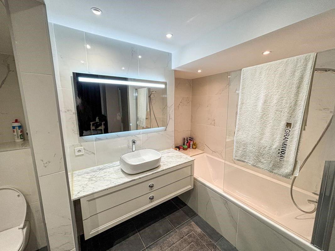Современный душ, отдельный туалет и место для хранения завершают облик квартиры. Вы оцените дополнительные удобства: обратимый кондиционер, оригинальный массивный дубовый паркет, бронированная дверь с замком Fichet, большая подземная кладовая площадью 10 м² и коллективная парковка в рамках недвижимости.