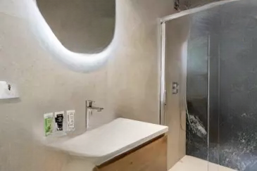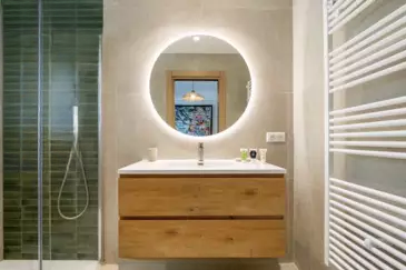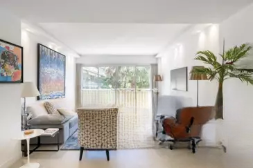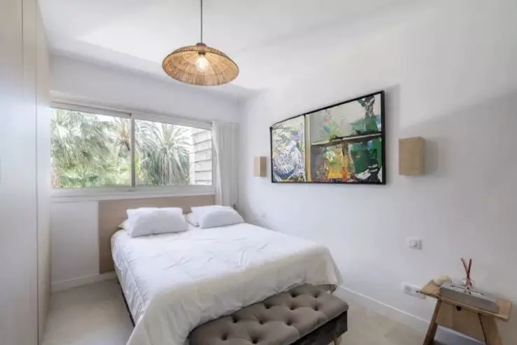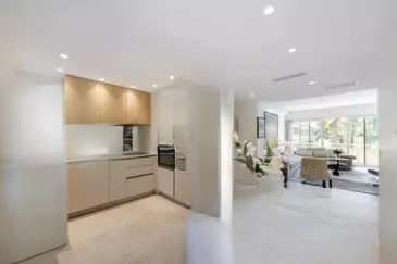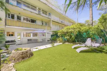 Апартаменты состоят из гостиной с выходом на террасу, столовой и полностью оборудованной кухни с доступом в сад площадью 200 кв. м. Спальная зона включает две спальни и две душевые комнаты с туалетом.