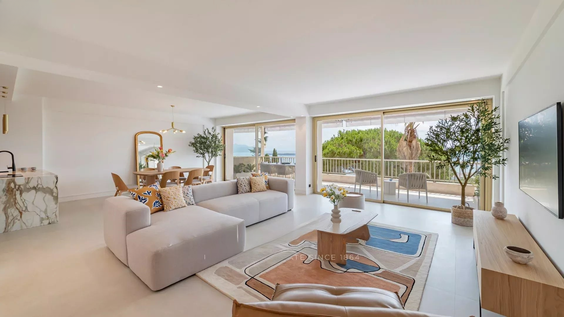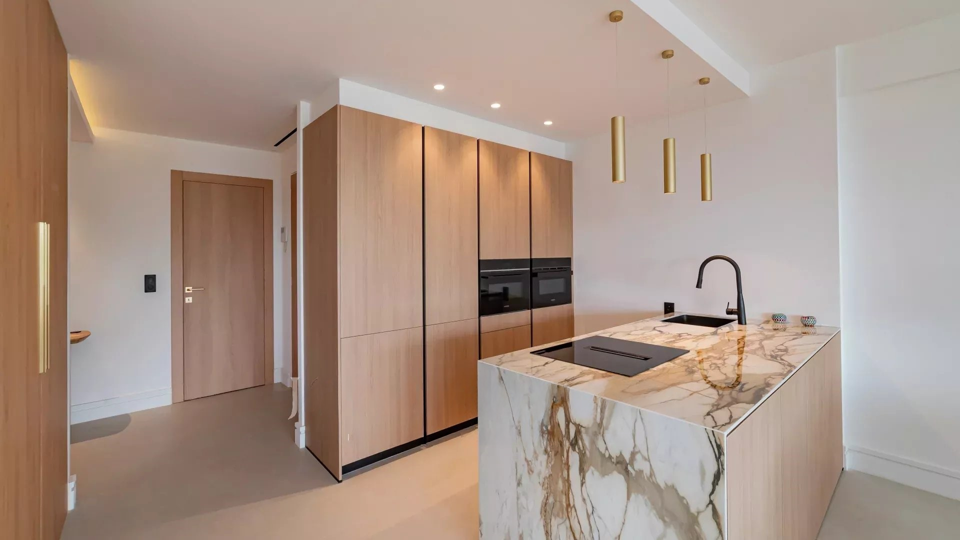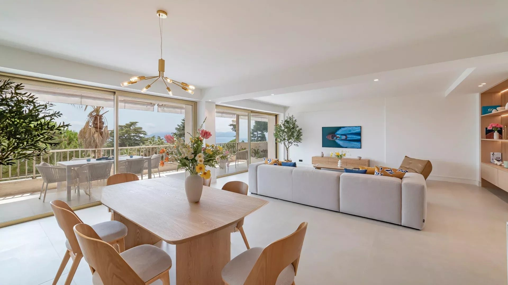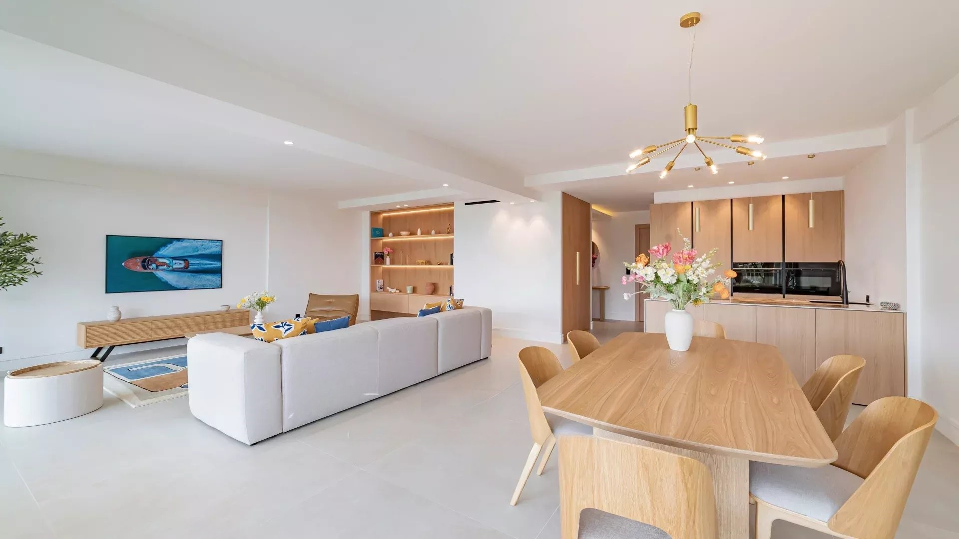 Просторная, светлая гостиная с выходом на террасу с видом на море и парк, полностью оборудованная открытая кухня, две спальни с ванными комнатами. Современный дизайн, тщательная отделка.